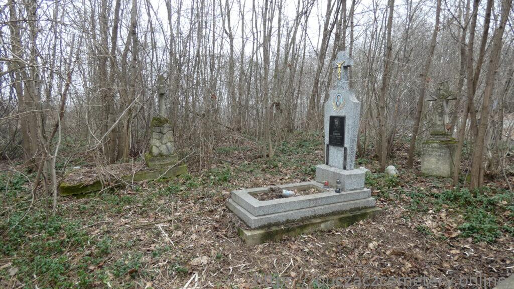 Місце поховання позначене двоступеневим надгробком, у голові якого встановлено хрест на постаменті у вигляді скель і підстави. Лице хреста з виїмкою, що повторює його форму. Зерниста основа. Плінфа зі скошеними верхніми краями, спереду табличка у вигляді розгорнутого сувою з вигравіюваним написом.