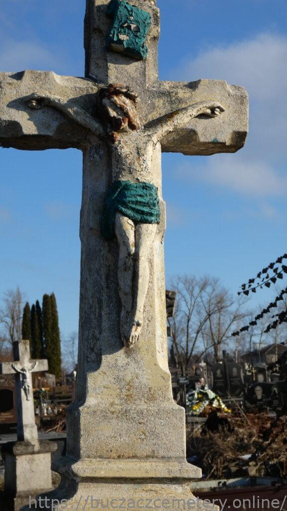 Місце поховання позначено хрестом на двоступеневому постаменті та підставці, з перев’язкою. Хрест зі скошеними краями, з виступами, на постаменті. На перехресті рамен — рельєфна фігура Христа з титулом угорі. Зерниста основа. Перша сходинка цоколя з профільованими верхніми краями. На лицьовій стороні гравійована рамка з чверть кругло зрізаними верхніми кутами, з вигравіюваний написом. Друга сходинка цоколя звужується до верху, з профільованими верхніми краями. З лицьового боку панель закрита гострою аркою.