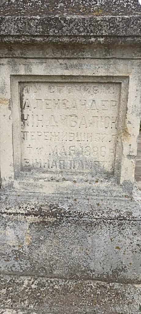 Напис: Ту спочиває Александер Кіндибалюк проживший 57 літ + 17 Мая 1886 р. ВІЧНАЯ ПАМЯТЬ