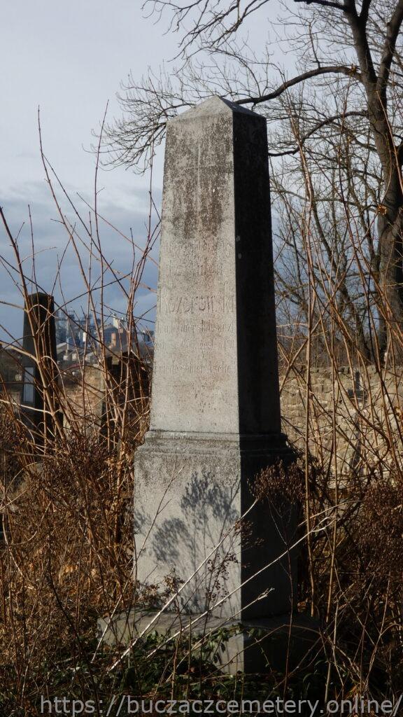 Місце поховання позначене обеліском на двоступеневому постаменті і основа, в бетонній смузі. Попереду на обеліску висічено хрест ромбоподібними закінчені герби, внизу вигравіюваний напис. Перша сходинка цоколя зі скошеними верхніми краями. Була чавунна огорожа, не збереглася.