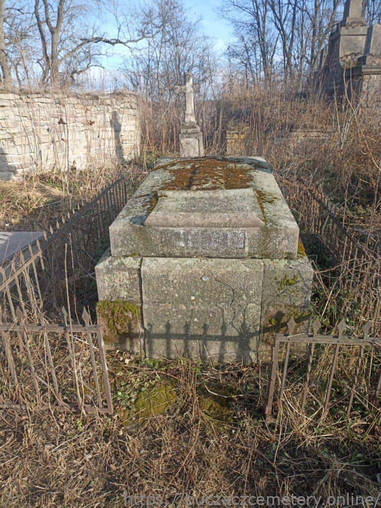 Земляна гробниця вкрита триступеневим надгробком зі стилізованим під стовбур дерева барельєфним хрестом, під яким табличка у вигляді розгорнутого сувою з вигравіюваним написом (1). Спереду, на третій сходинці надгробку, мармурова дошка з вигравіруваним написом (2). Вся територія огороджена чавунним парканом.