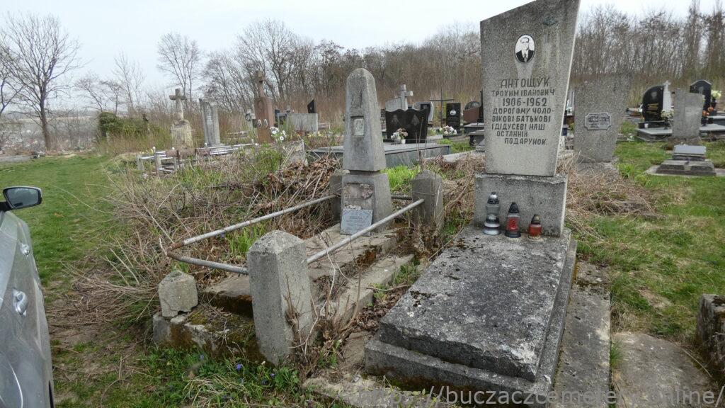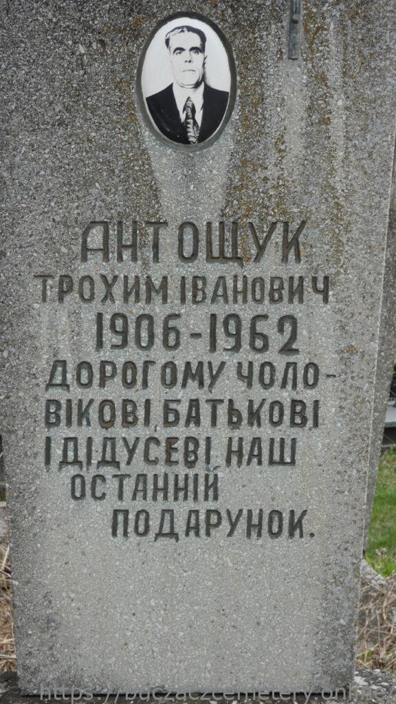 Напис: АНТОЩУК ТРОХИМ ІВАНОВИЧ/1906-1962/ДОРОГОМУ ЧОЛО-/ВІКОВІ БАТЬКОВІ/ І ДІДУСЕВІ НАШ/ ОСТАННІЙ/ ПОДАРУНОК/