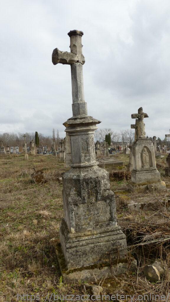 Місце поховання позначено хрестом на триступеневому постаменті та підставі. Хрест із восьмикутними раменами, з виступами та пірамідальними прикріпленнями, на постаменті. Перша сходинка цоколя з профільованими верхніми краями. Друга сходинка цоколя з прямокутним підвищенням, що переходить у восьмерик, обрамлений з чотирьох сторін невеликими пірамідками. Спереду розташована панель, що повторює форму другої сходинки цоколя із загостреними верхніми кутами. На ньому вигравіюваний напис. Третя сходинка цоколя у вигляді восьмигранної башточки з сильно навантаженим карнизом. З боків розташована зерниста панель із загостреними верхніми кутами.