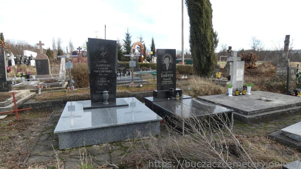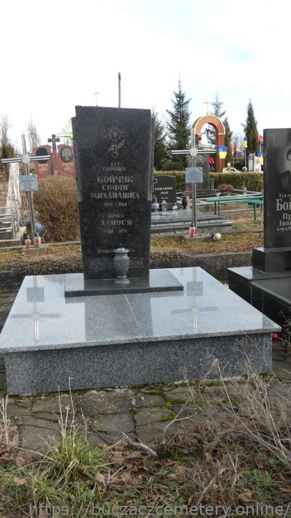 Напис: ТУТ СПОЧИВАЄ БОЙЧУК СОФІЯ МИХАЙЛІВНА 1920-1963/ Дочка ДАНУСЯ 1950-1976/ ВІЧНА ПАМ’ЯТЬ//.