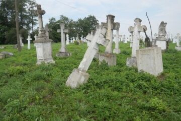 Місце поховання позначене хрестом на постаменті. Хрест із раменами, що завершуються трилієм, з ліпниною. Плінфа, що звужується до верху, з профільованими верхніми краями. На лицьовій стороні панель з вигравіруваним написом. Показати на карті Надпис: tu / leży / petranela / Ja[…]z[…]kie / wicz […] 77 / […] 1802 2 1879 Читати далі