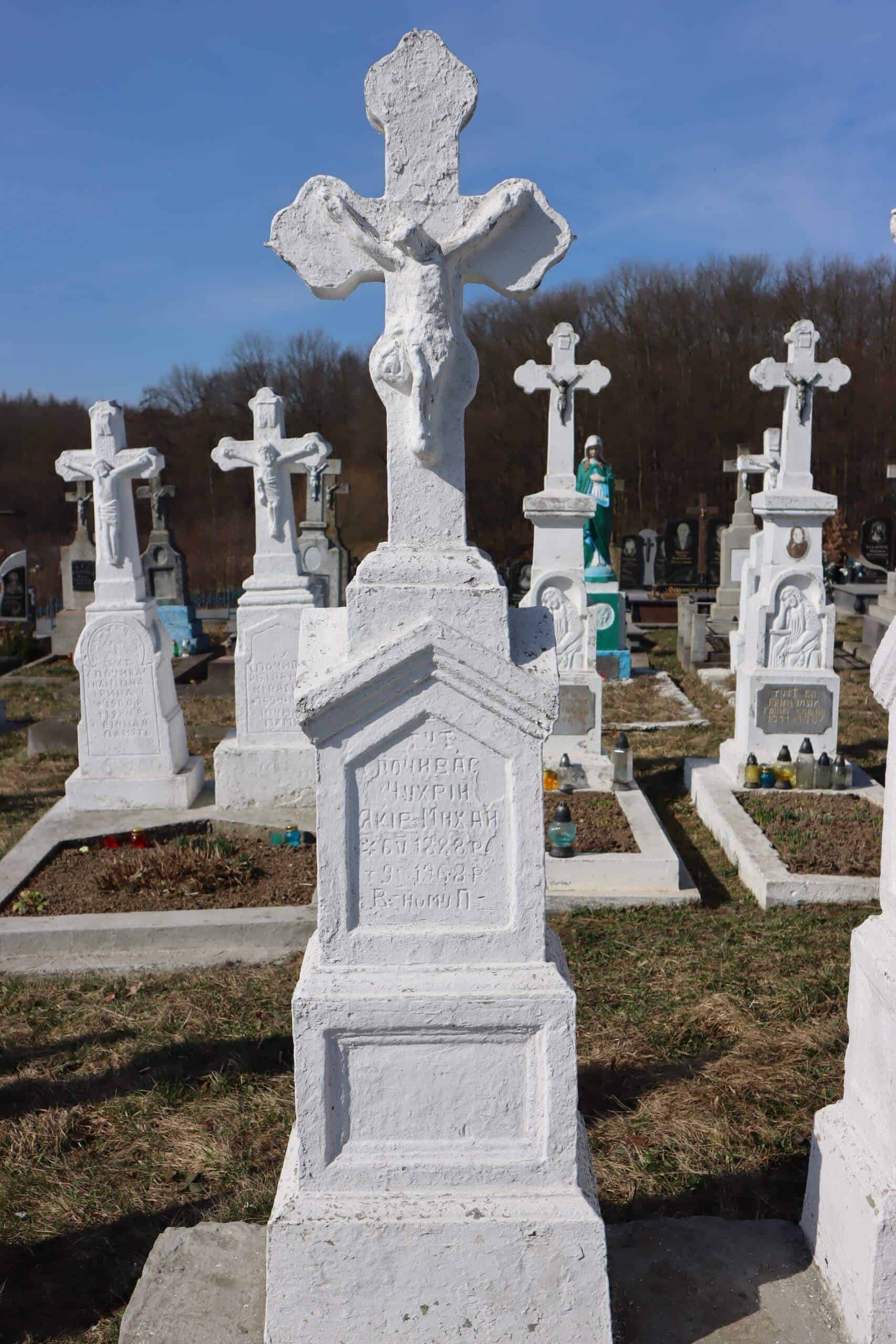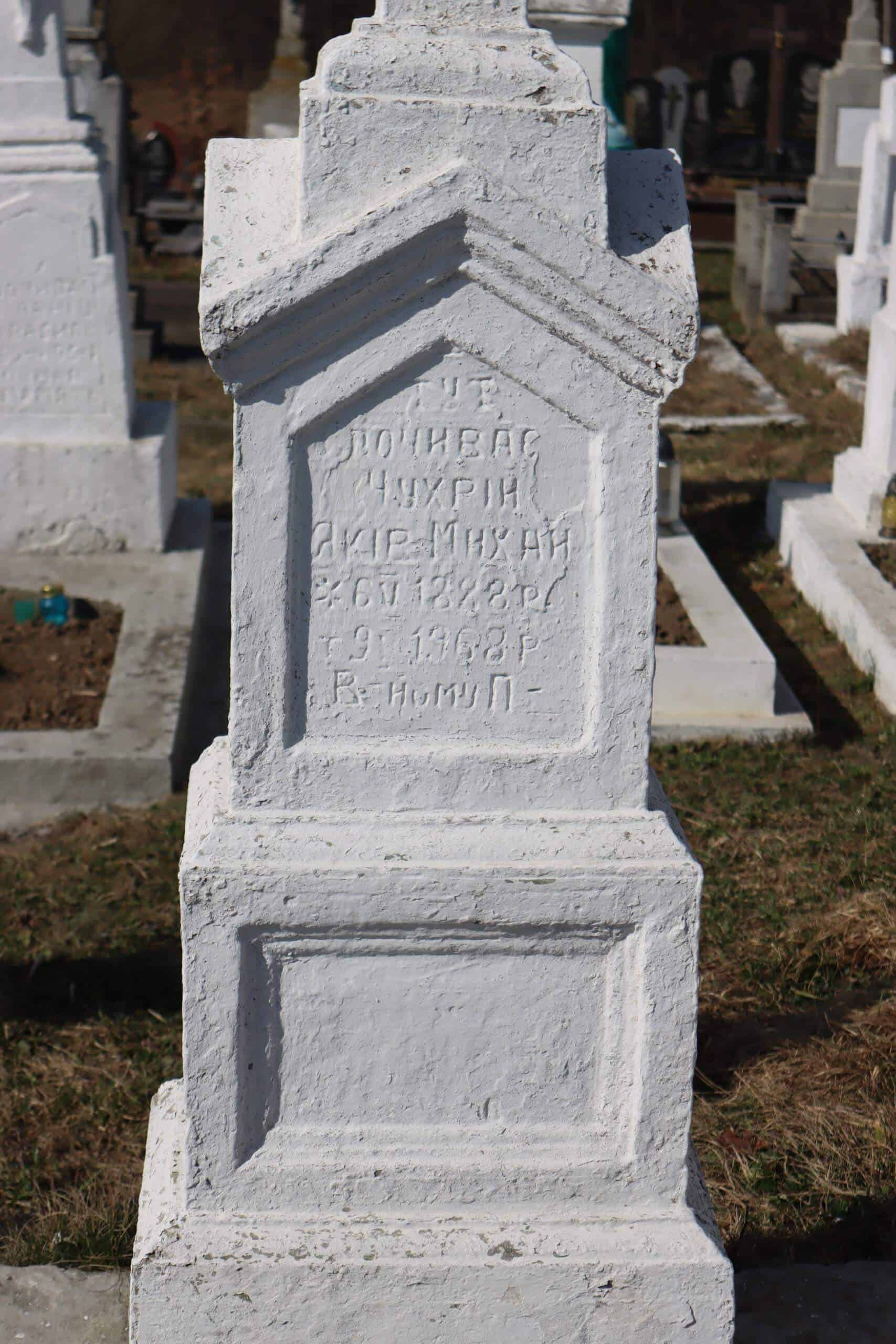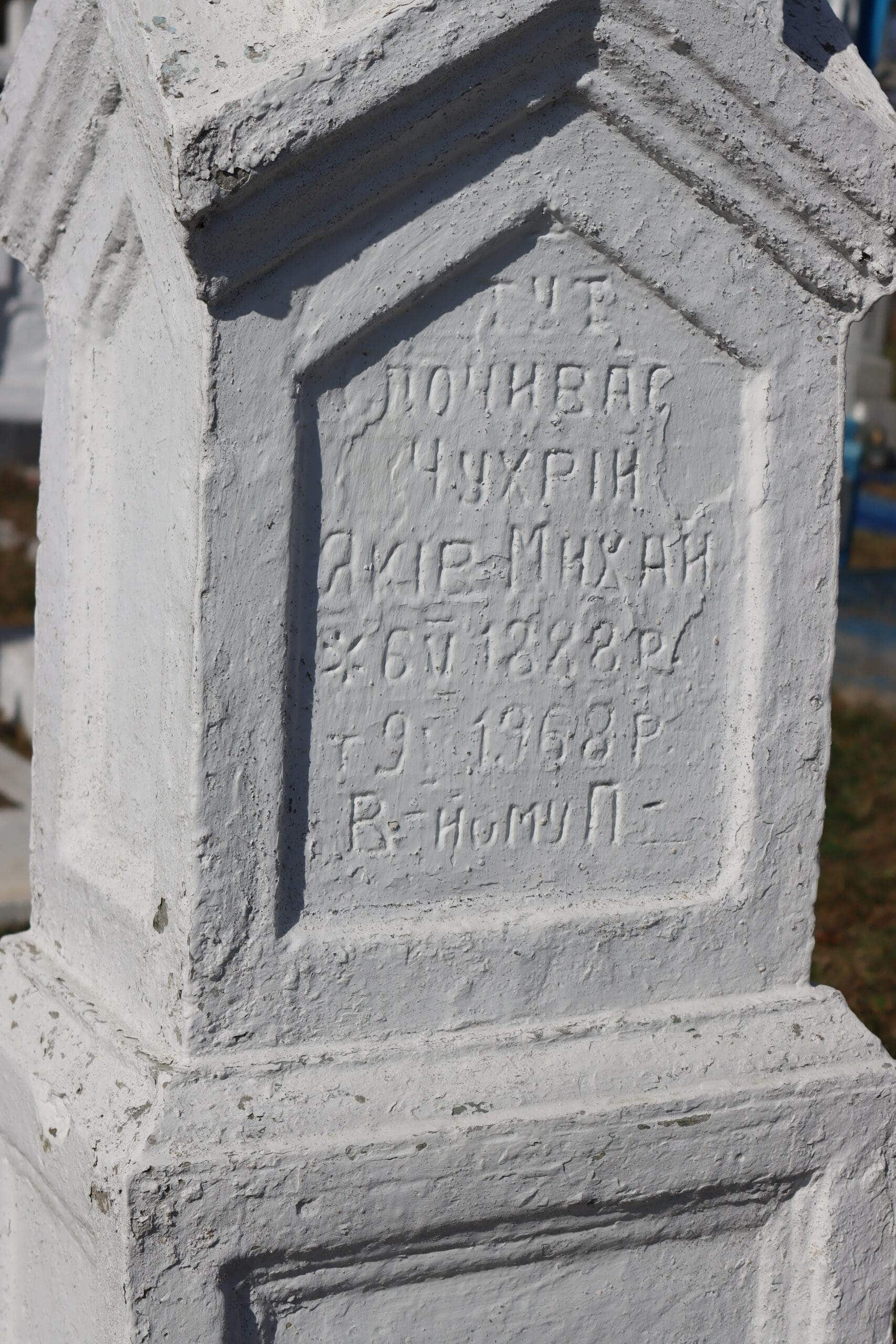 Номер могили: 166 Похований (на): ЧУХРІЙ Яків Михайлович 06.05.1888 – 09.05.1968 ЧУХРІЙ Марія Михайлівна 07.02.1892 – 09.05.1966 Матеріал: пісковик, бетон