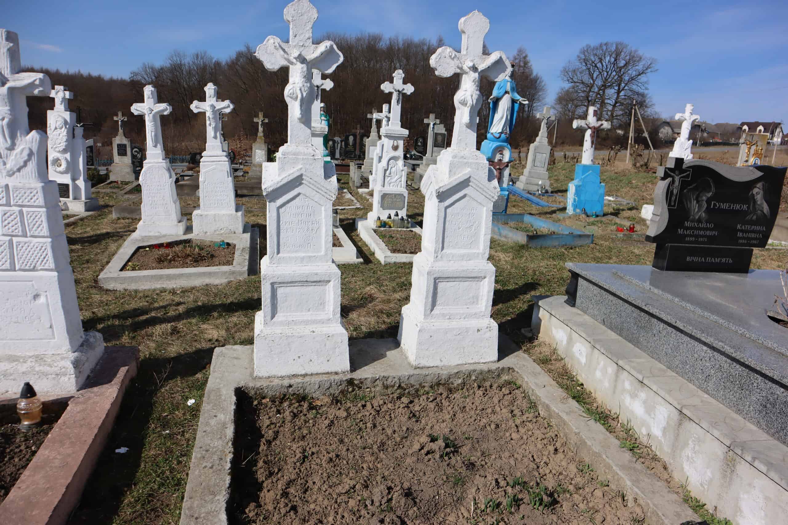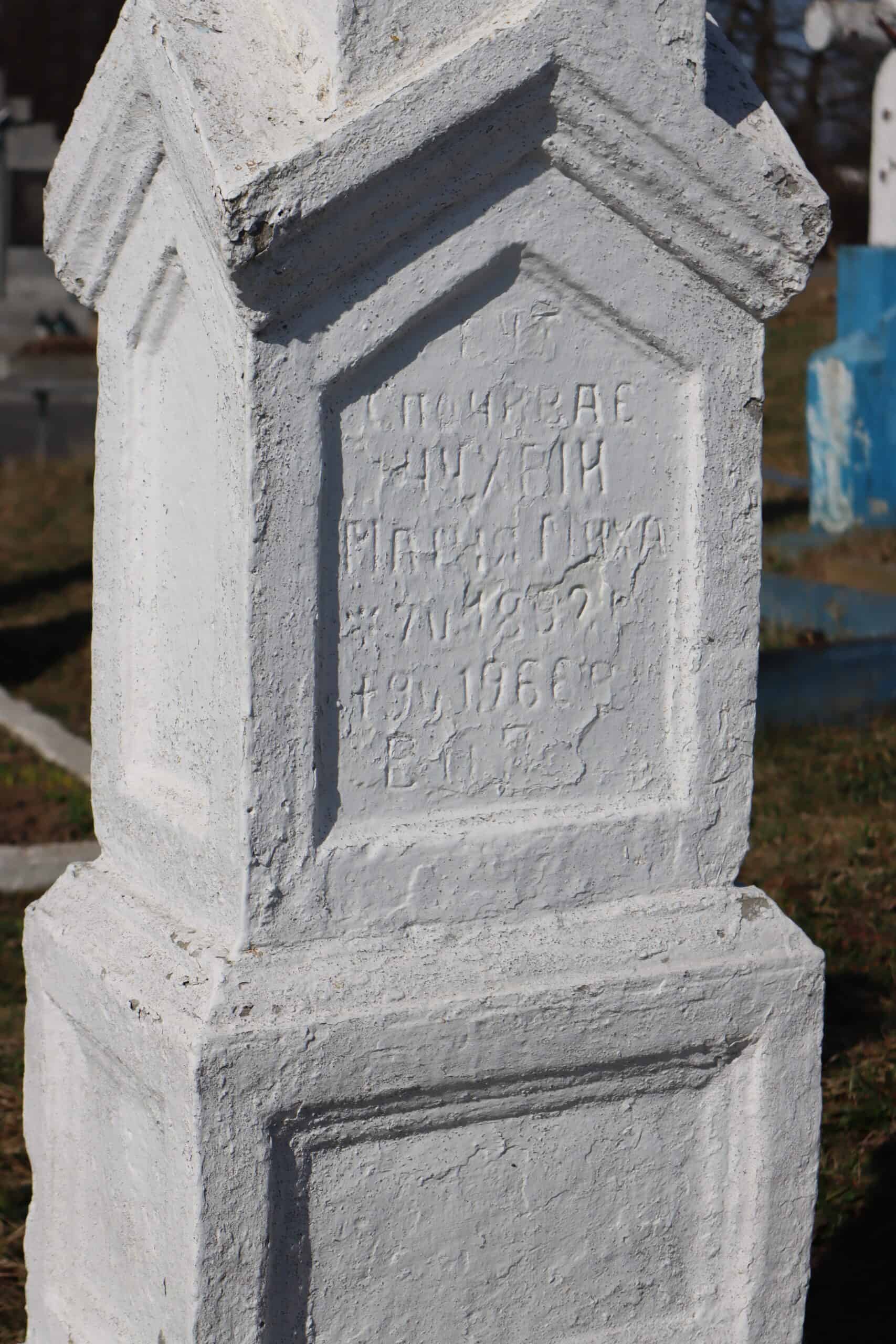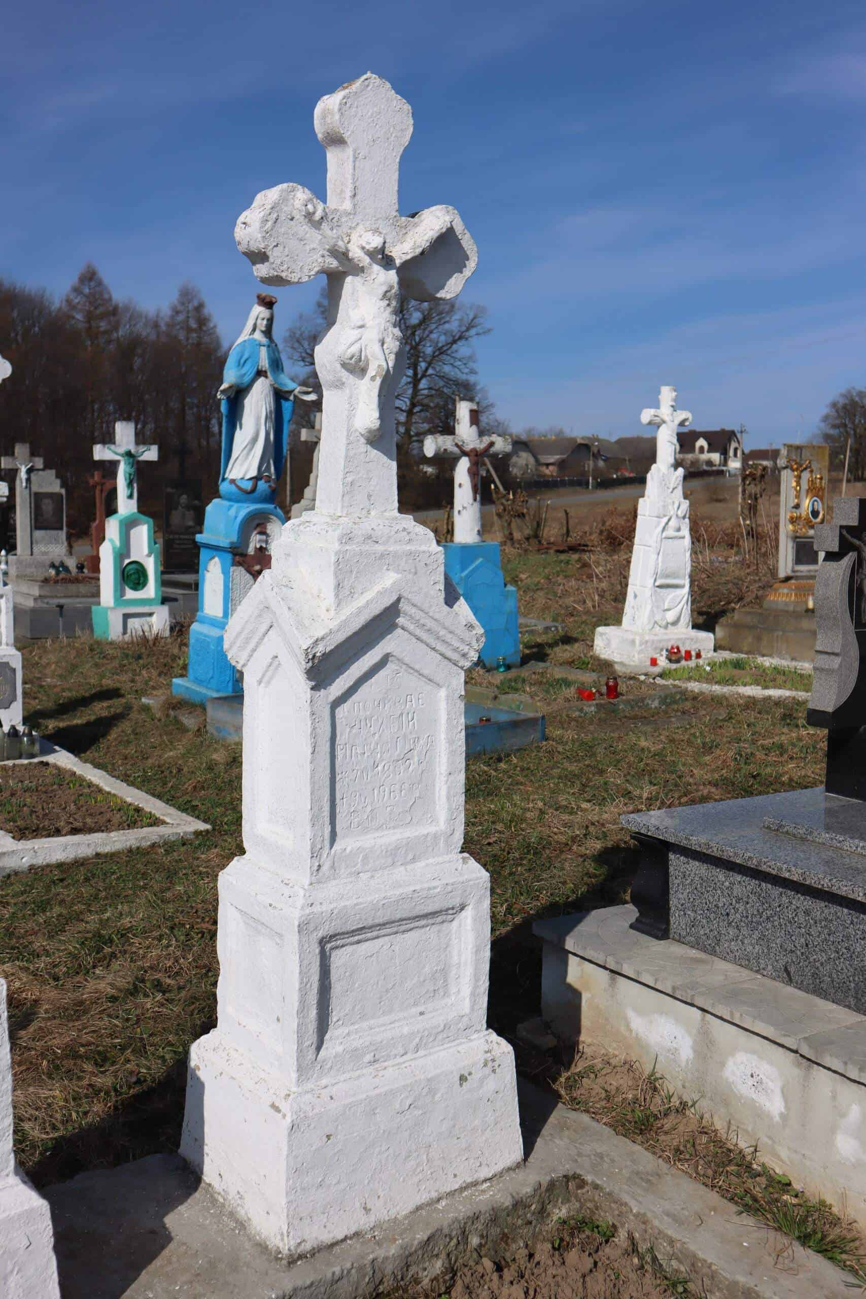 Номер могили: 166 Похований (на): ЧУХРІЙ Яків Михайлович 06.05.1888 – 09.05.1968 ЧУХРІЙ Марія Михайлівна 07.02.1892 – 09.05.1966 Матеріал: пісковик, бетон