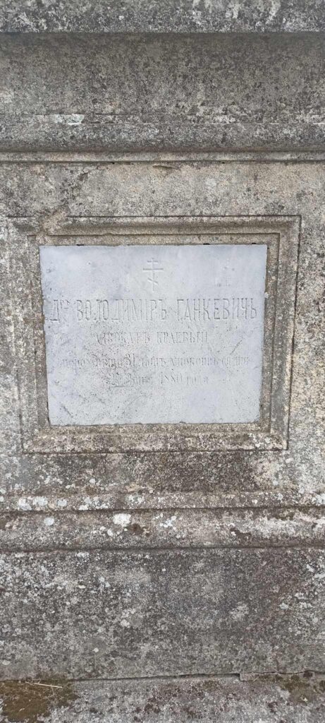 Напис: др. ВОЛОДИМИР ГАНКЕВИЧ АДВОКАТ КРАЙОВИЙ Проживший 31 літ упокоєвся дня 25 січня 1880 года