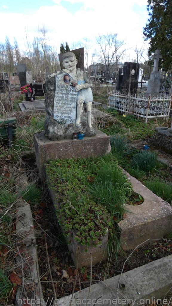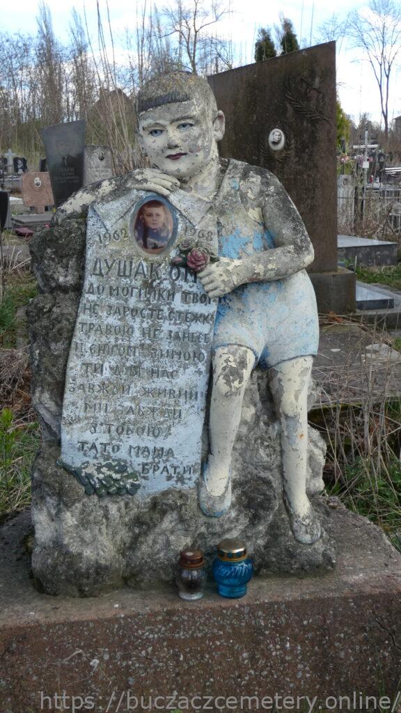 Напис:1962-1968/ Душак О.М./ До могилки твоєї/ не заросте стежка/ травою не занесе/ снігом зимою/ ти для нас завжди живий/ ми завжди/ з тобою/ тато мама брати/