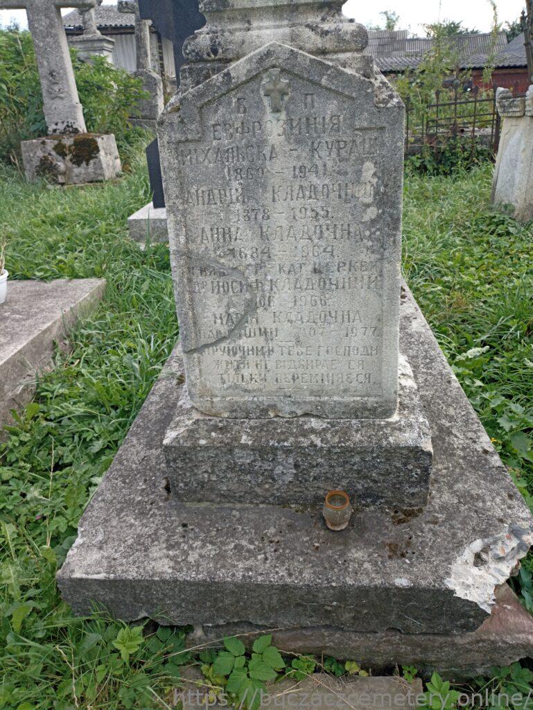 Напис: Б+П ЄЗФРОЗИНІЯ МІХАЛЬСЬКА-КУРАШ 1860-1941 АНДРІЙ КЛАДОЧНИЙ 1878-1955 АННА КЛАДОЧНА 1884-1964 СВЯ Р-КАТ ЦЕРКВИ ДР ЙОСИФ КЛАДОЧНИЙ 1906-1966 МАРІЯ КЛАДОЧНА ПАВЛИШИН 1907-1977 ВІРУЮЧИМ В ТЕБЕ ГОСПОДИ ЖИТТЯ НЕ ВІДБИРАЄТСЯ ТІЛЬКИ ПЕРЕМІНЯЄТСЯ