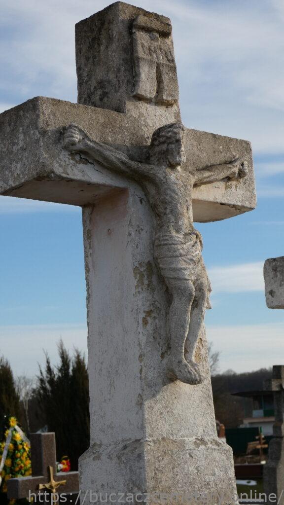 Місце поховання позначено хрестом на двоступеневому постаменті та підставці. Хрест на постаменті. На перехресті рамен — рельєфна фігура Христа з титулом угорі. Перша сходинка плінтуса зі скошеними верхніми краями. Друга сходинка цоколя з профільованими верхніми краями, накрита чотирисхилим дахом. З трьох сторін різьблені обрамлення з чверть кругло зрізаними верхніми кутами. На лицьовій стороні є подібна панель з вигравіюваним написом.