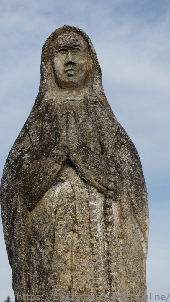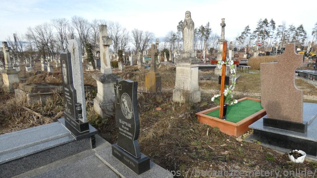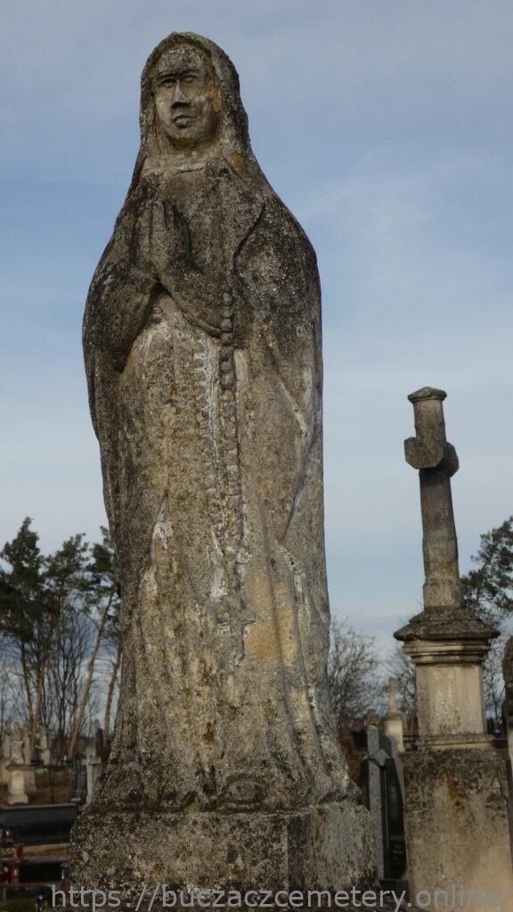 Місце поховання позначене статуєю Матері Божої Розарію на двоступеневому постаменті та підставі. Марія зі складеними в молитві руками, над лівою рукою висить розарій. Одягнена в довгу сукню і пальто, боса. Голова відбита. Перша сходинка плінтуса зі скошеними верхніми краями. Друга сходинка цоколя трохи звужується до верху, має спрощений антаблемент, що складається з архітрава та карниза, накритий чотирисхилим дахом. З кожного боку гравійованої рамки зі зрізаними на чверть круглі верхніми кутами, з вигравіюваним написом спереду.