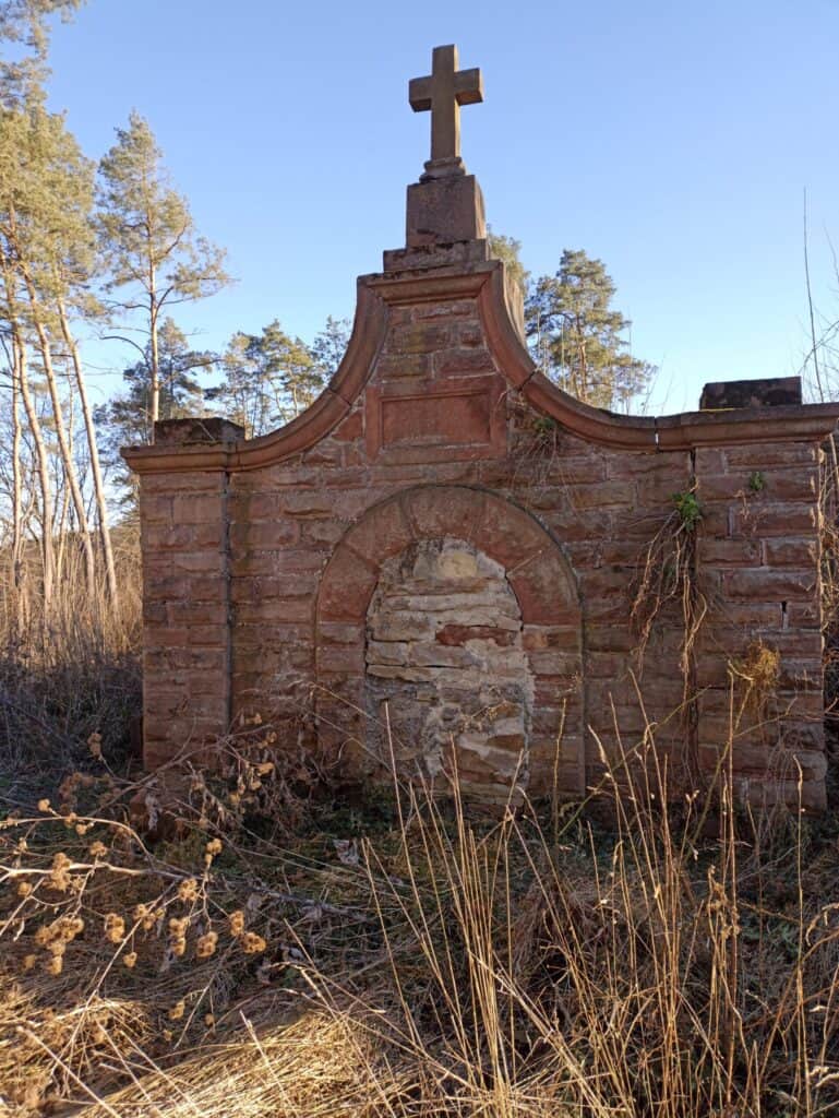 Гробниця має прямокутний план і перекрита двосхилим дахом з висіченим спрощеними волютами фронтоном і увінчаним хрестом на розширеному цоколі. Передній фасад закритий пілястровими стрічками, на яких спочатку були обеліски (тепер вони лежать поряд з гробницею). На осі вхідний отвір закритий повною аркою, нині замурованою. Зверху дошка з профільованими краями та вигравіруваним написом.