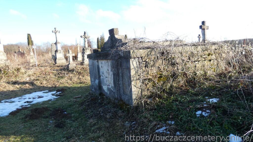 Могила має прямокутний план і перекрита плитою з увігнуто-опуклим верхом і хрестом на постаменті. На осі фасаду замурований прямокутний вхідний отвір, огороджений двома панелями, на яких первісно містилися дошки з написами. Над ним панно з вигравіюваним написом.