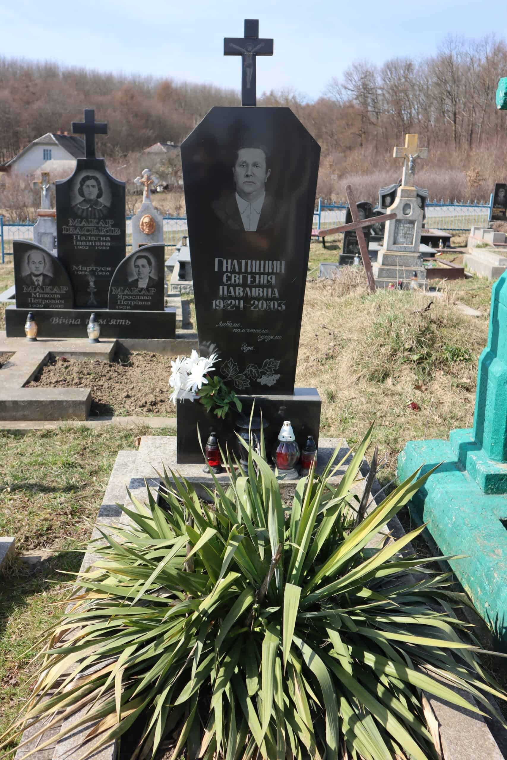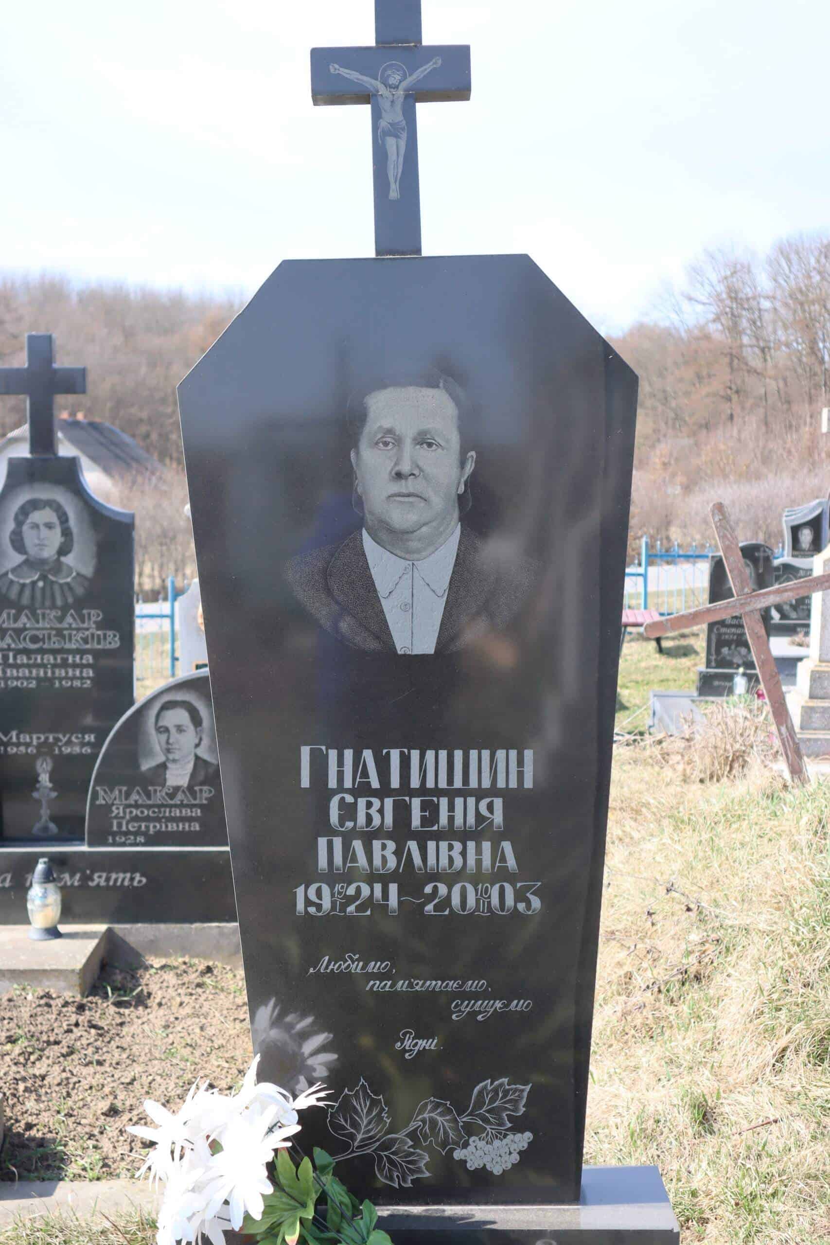 Номер могили: 457Похований (на): ГНАТИШИН Євгенія Павлівна 19.01.1924 – 10.02.2003Напис: Любимо, пам’ятаємо, сумуємо. РідніМатеріал: граніт, бетон ПЕРЕГЛЯНУТИ НА КАРТІ Переглядів: 8Категорії: ЦвітоваТеги: Buchach cemeteriesБучачКладовищаМогилаЦвітова 0 коментарівЗалишити відповідь Скасувати коментарВаша e-mail адреса не оприлюднюватиметься. Обов’язкові поля позначені * Ім'я * Email * Сайт Що в вас на думці? Зберегти моє ім'я, e-mail, та адресу сайту в цьому браузері для моїх подальших коментарів.