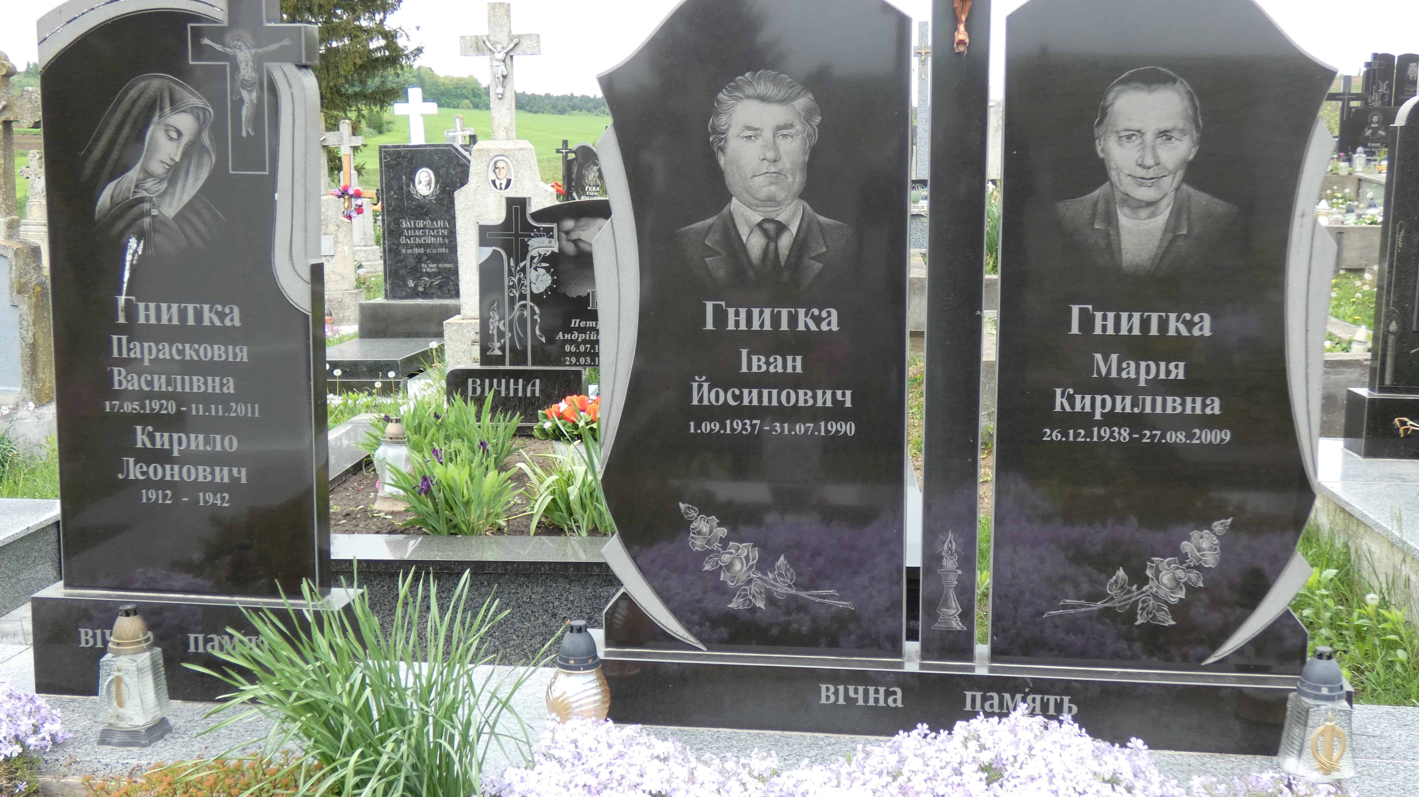 Похований (на): Гнитка Парасковія Василівна 17.05.1920-11.11.2011 Гнитка Кирило Леонович 1912-1942 Гнитка Іван Йосипович 01.09.1937-31.07.1990 Гнитка Марія Кирилівна 26.12.1938-27.08.2009