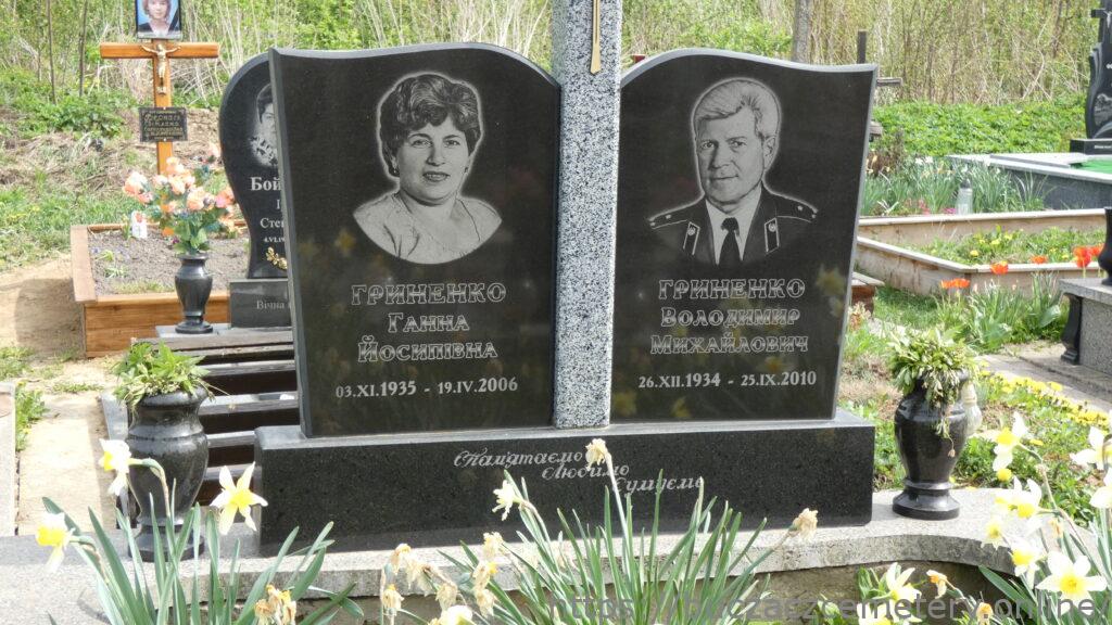 Напис: ГРИНЕНКО Ганна Йосипівна 03.ХІ.1935-19.IV.2006/ ГРИНЕНКО Володимир Михайлович 26.ХІІ.1934-25.ІХ.2010/Пам’ятаємо, любимо, сумуємо