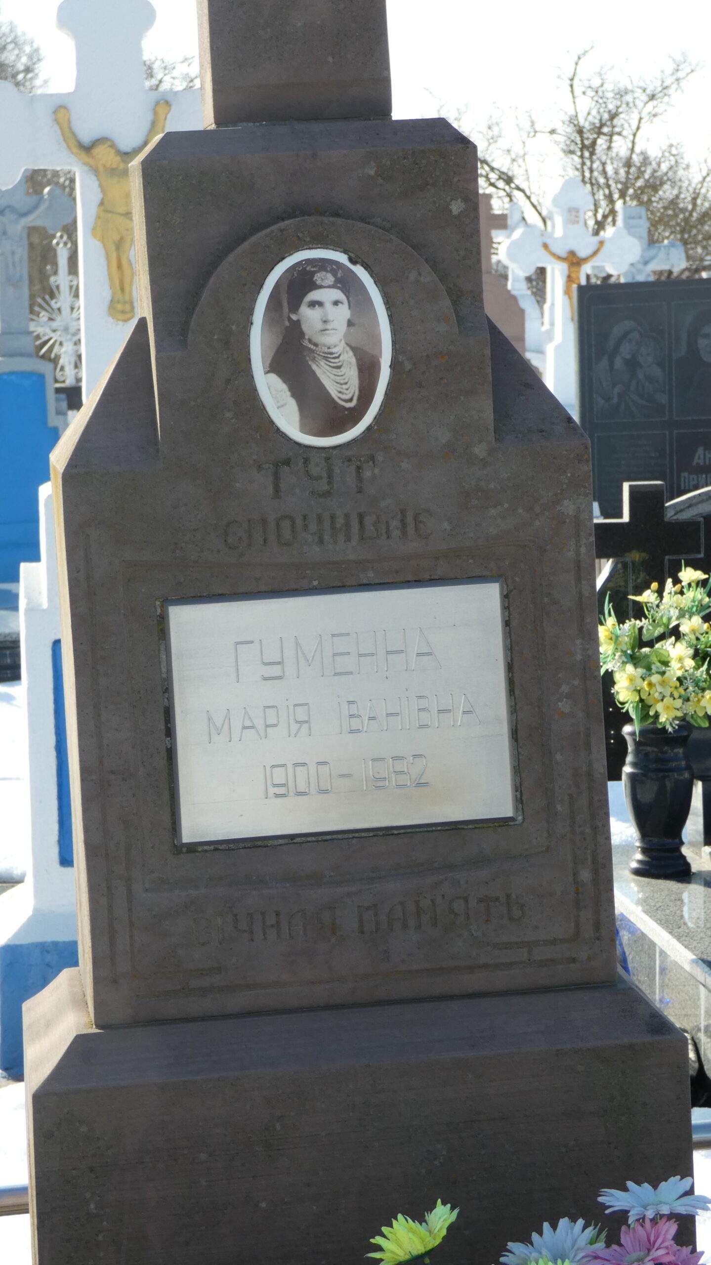 Номер могили: 656Номер кварталу: 2Похований (на): ГУМЕННА МАРІЯ ІВАНІВНА 1900 – 1982 ПЕРЕГЛЯНУТИ НА КАРТІ Переглядів: 16Категорії: ЗеленаТеги: Buchach cemeteriesБучачЗеленаКладовищаМогила 0 коментарівЗалишити відповідь Скасувати коментарВаша e-mail адреса не оприлюднюватиметься. Обов’язкові поля позначені * Ім'я * Email * Сайт Що в вас на думці? Зберегти моє ім'я, e-mail, та адресу сайту в цьому браузері для моїх подальших коментарів.