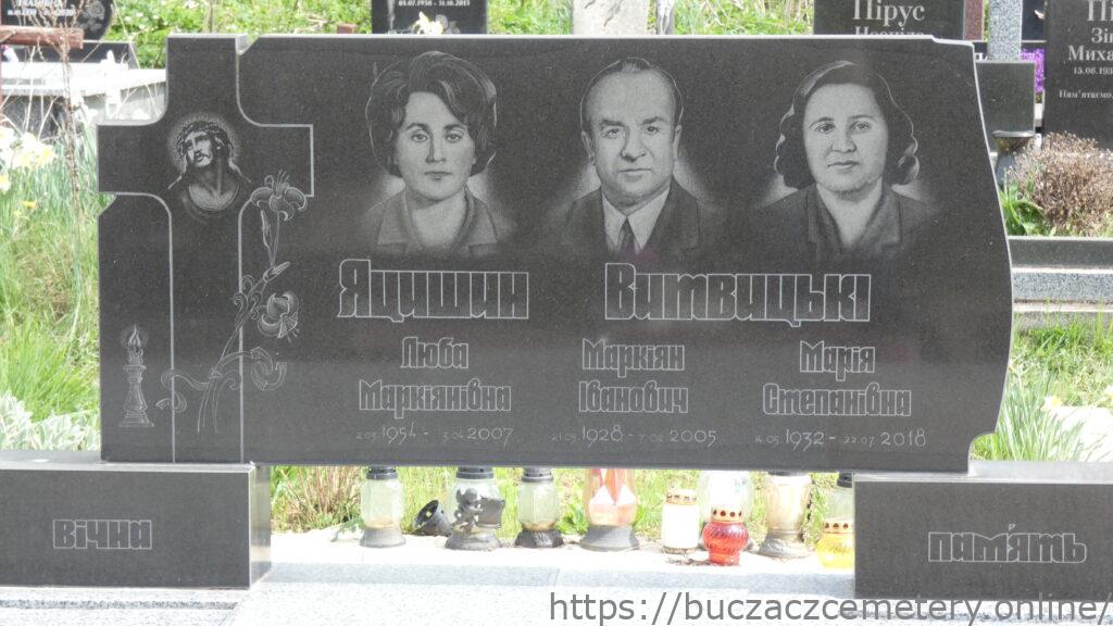 Напис: Яцишин Люба Маркіявнівна 2.03.1954-3.04.2007/ Витквицькі Маркіян Іванович 21.05.1928-7.02.2005/ Марія Степанівна 14.05.1932-22.07.2018/ ВІЧНА ПАМ’ЯТЬ/