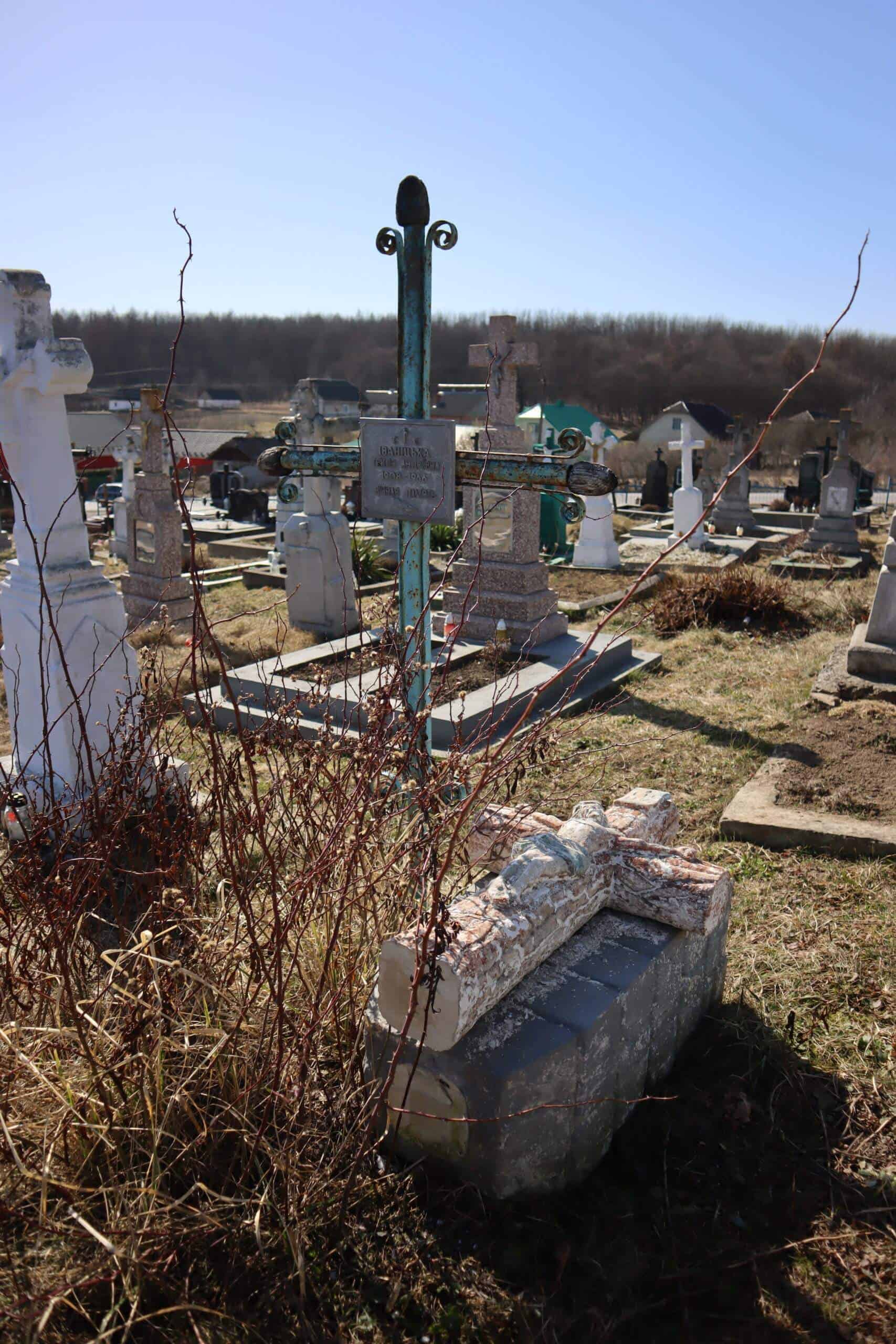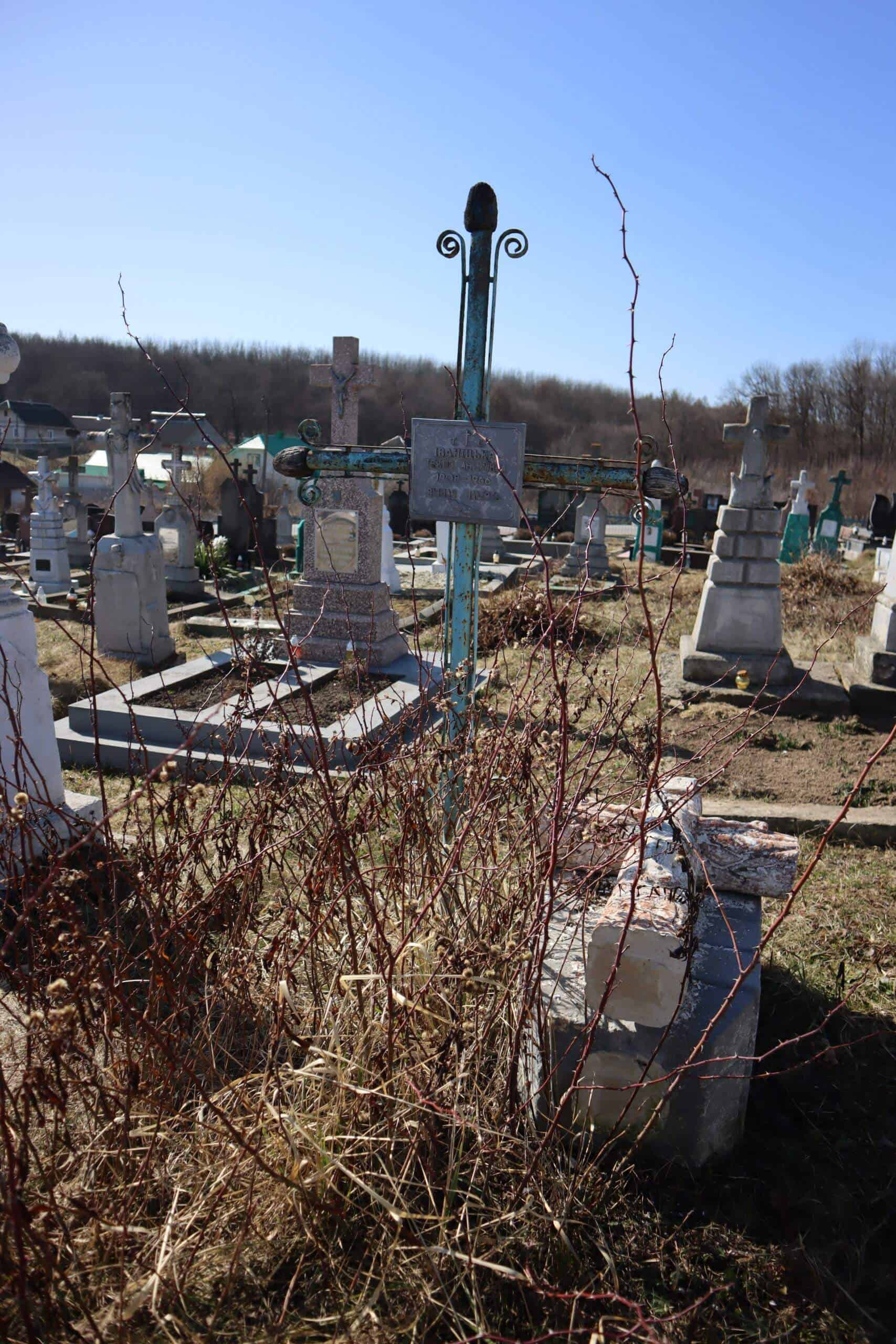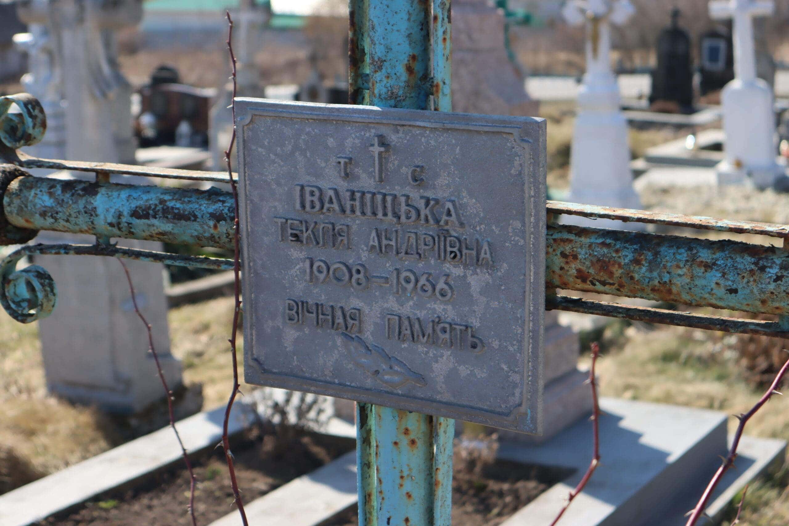 Номер могили: 452 Похований (на): ІВАНІЦЬКА Текля Андріївна 1908 – 1966 Напис: Вічная пам’ять Матеріал: метал Пошкодження: обабіч цього пам’ятника знаходиться інший зруйнований без розпізнавальних написів