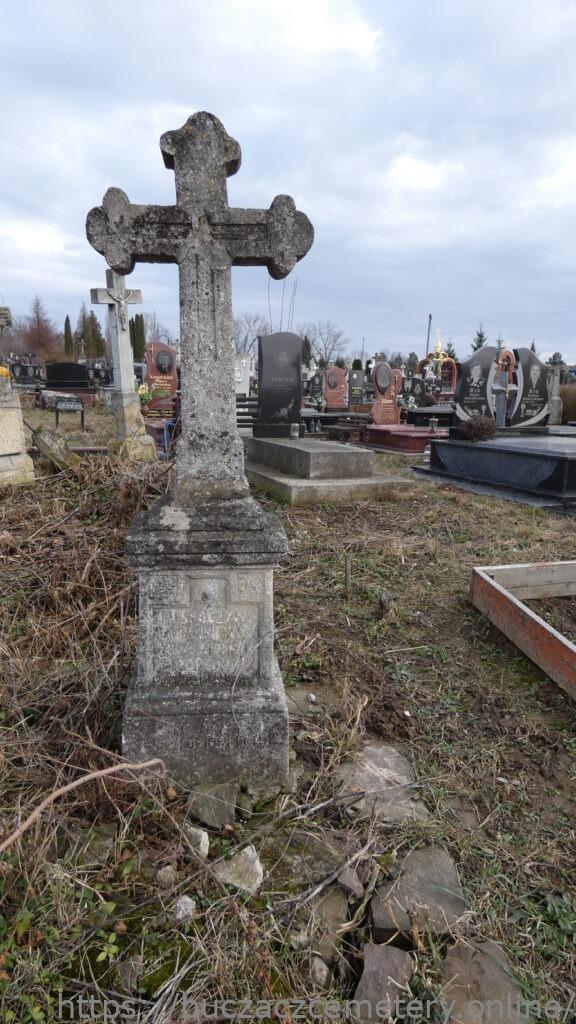 Місце поховання позначено хрестом на двоступеневому постаменті та підставці, з перев’язкою. Хрест із раменами, що завершуються у вигляді трилисника, на постаменті. На перетині рамен висічено менший хрест. Перша сходинка плінфи з профільованими верхніми краями, з гравійованим написом на лицьовій частині (1). Друга сходинка цоколя через профілювання переходить ступеневий дах. Спереду — планкова рама, закрита простою нависаючою аркою з вигравіюваним написом (2).