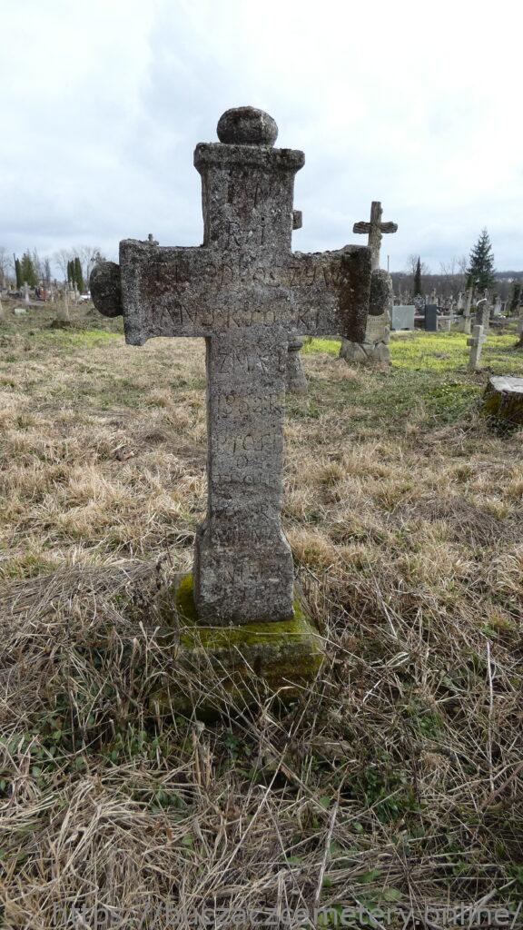 Місце поховання спочатку було позначене хрестом на низькому постаменті. Хрест із раменами, що закінчуються ковпаками з ґудзиками, на постаменті, нині перекинутий. Спереду є вигравіюваний напис. Цоколь обшитий профільованою дошкою.