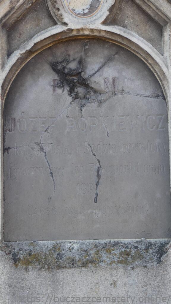 D[.O.]M. / JÓZEF POPKIEWICZ / c.k. Starosta i Sędzia powiatowy / przeżywszy lat 79 umarł 1 maja / 1891. / Cześć jego popiołom! //.