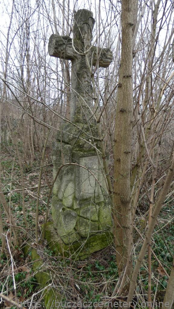 Місце поховання позначене хрестом, стилізованим у вигляді стовбура дерева на постаменті у вигляді скель і підставі з стрічкою. Хрест, прикрашений барельєфним листям і плодами дуба. Зерниста основа. На постаменті спереду встановлено табличку в обрамленні колосся з вигравіюваним написом.