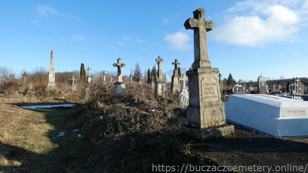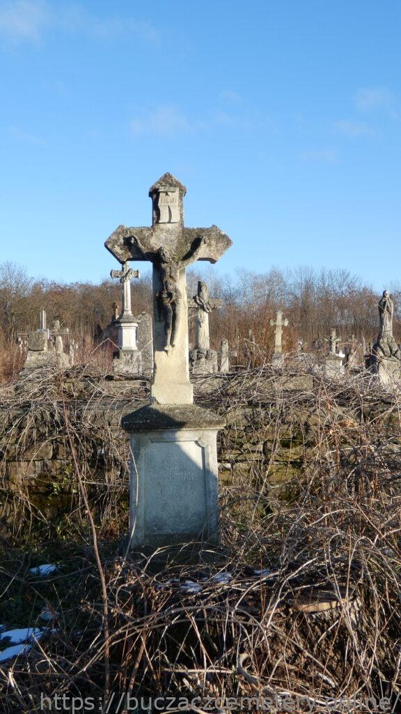 Місце поховання позначено хрестом на двоступеневому постаменті. Хрест із ромбоподібними раменами на постаменті. На перехресті рамен — рельєфна фігура Христа з титулом угорі. Перша сходинка цоколя з профільованими верхніми краями. Друга сходинка цоколя вкрита чотирисхилим дахом. З трьох сторін різьблені обрамлення з чверть кругло зрізаними верхніми кутами. На лицьовій стороні є подібна панель з вигравіюваним написом.