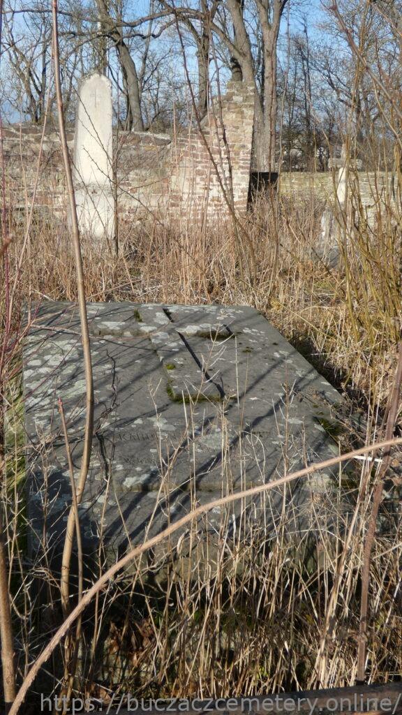 Місце поховання позначено двоступеневим діагональним надгробком, на якому барельєфно зображено хрест із раменами, що завершуються гніздами, а внизу — дошка з вигравіюваним написом. З передньої сторони є огорожа, спільна з надгробком Юзефа Жиха, у вигляді двох стовпів, з’єднаних чавунними прутами.