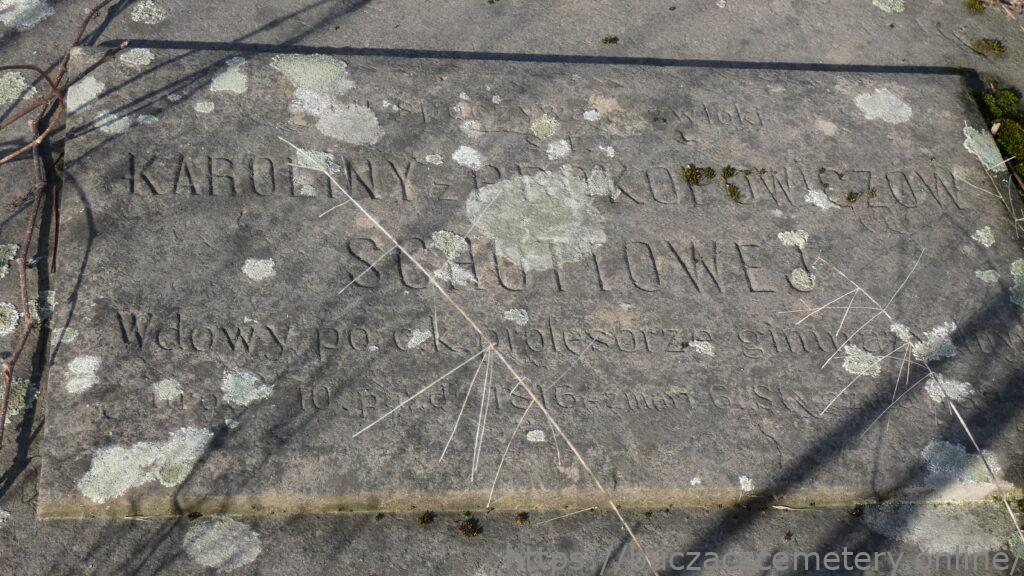 Tu spoczywają zwłoki / KAROLINY z PROKOPOWICZÓW / SCHUTTOWEJ / Wdowy po c.k. profesorze gimnazjalnym / urodz. 10 paźdź. 1816 zmarł [6]. stycnia 1896. //.