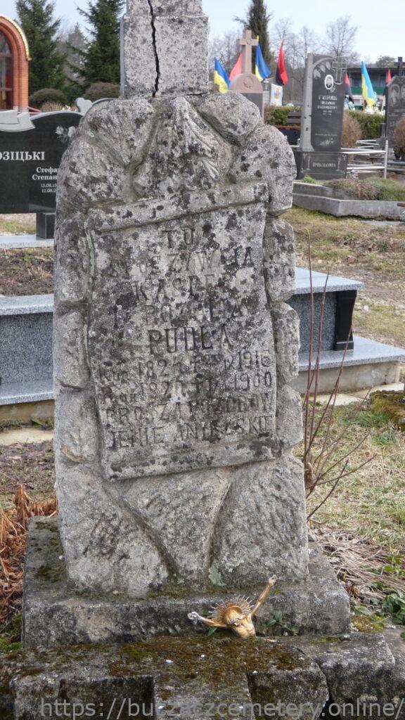 TU / SPOCZYWAJA / KASPER / I ROZALIA / PUDŁA / K UR. 1824 + 25 IX 1916 / R UR. 1820 + 1 III 1900 / PROSZĄ O POZDORW / IENIE ANIELSKIE //.