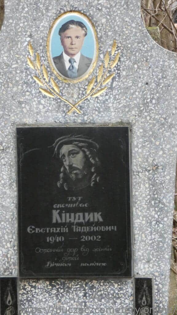 Напис: Тут спочиває Кіндик Євстаїій Тадейович 1940-2002/ Останній дар від жінки і дітей/ Вічная пам’ять/