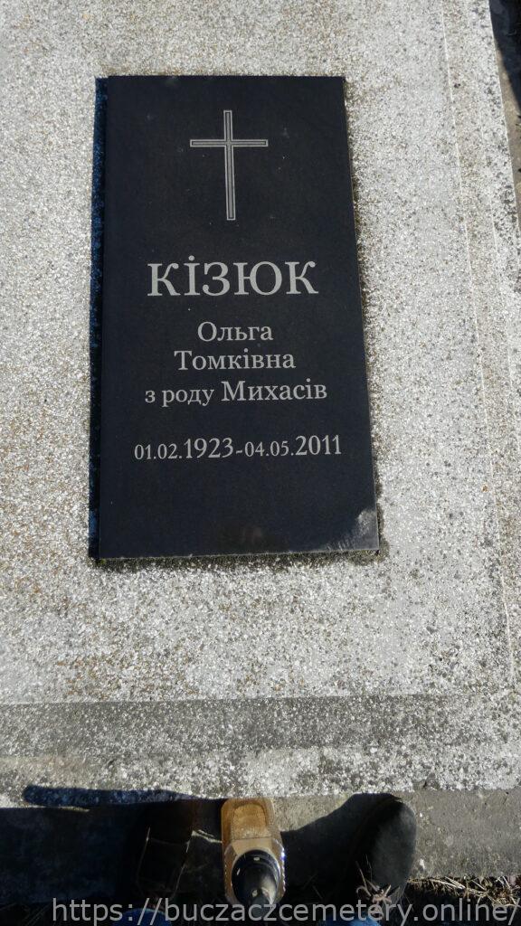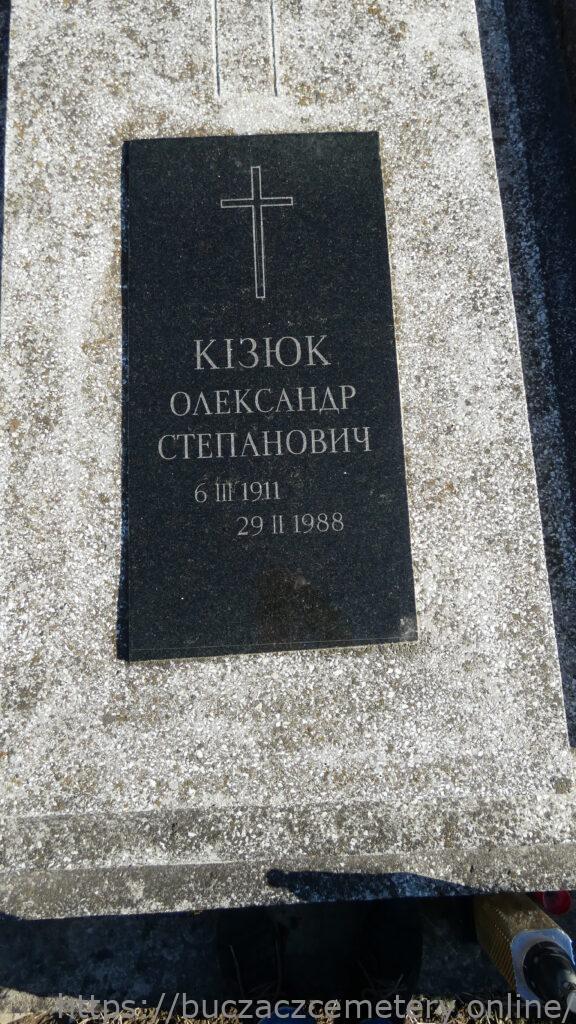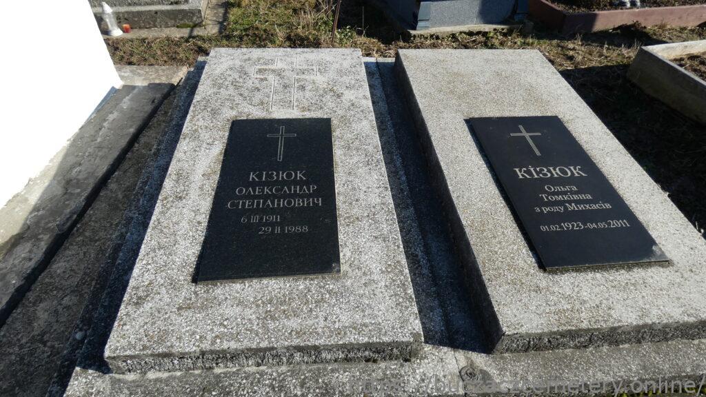 Напис: КІЗЮК ОЛЕКСАНДР СТЕПАНОВИЧ 6.ІІІ.1911-29.ІІ.1988/ КІЗЮК Ольга Томківка з роду Михасів 01.02.1923-04.05.2011