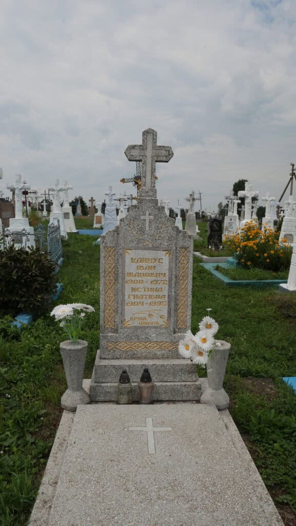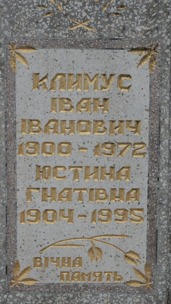 Надпис: “Климус Іван Іванович 1900-1972 Климус Юстина Гнатівна 1904-1995 вічна пам’ять”