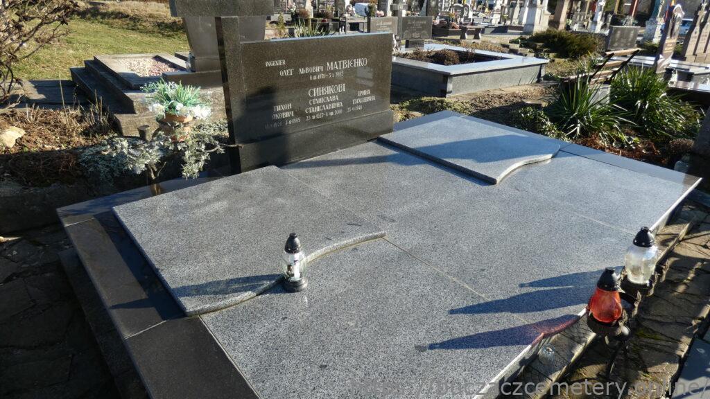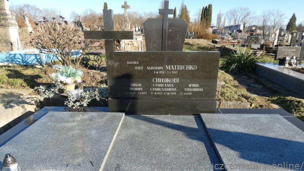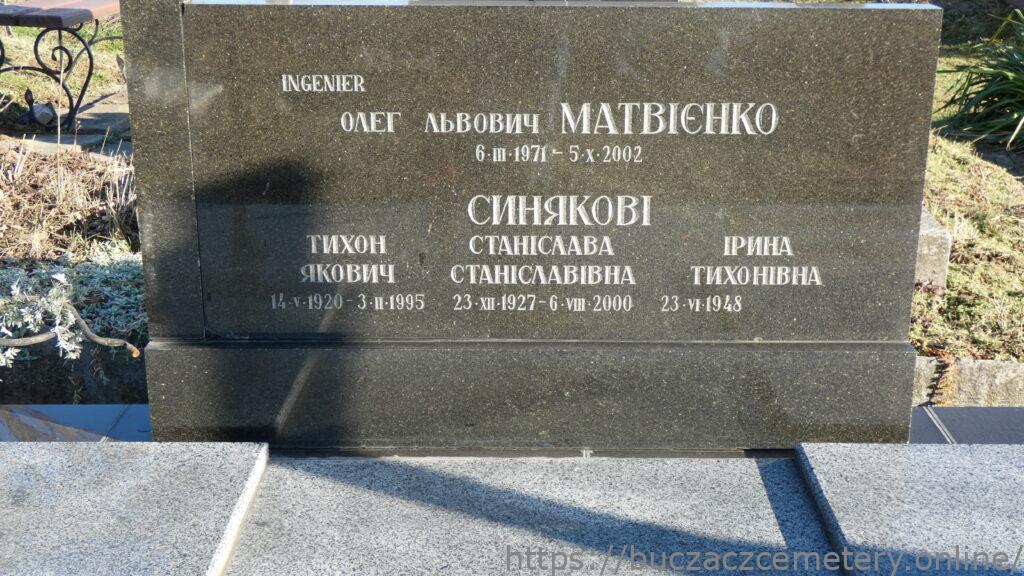 Напис: INGINIER/ ОЛЕГ ЛЬВОВИЧ МАТВІЄНКО 6.ІІІ.1971-5.Х.2002/ СИНЯКОВІ/ ТИХОН ЯКОВИЧ 14.V.1920-3.ІІ.1995/ СТАНІСЛАВА СТАНІСЛАВІВНА 23.ХІІІ.1927-6.VIII.2000/ ІРИНА ТИХОНІВНА 23.VI.1948-