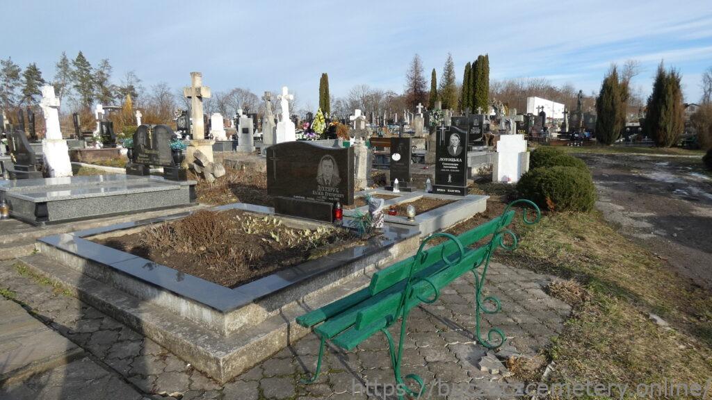 Місце поховання позначено трьох ступеневою гранітною прямокутною стелою на якій витаврувано портрет та напис. В лівому верхньому куті стели вирізаний хрест