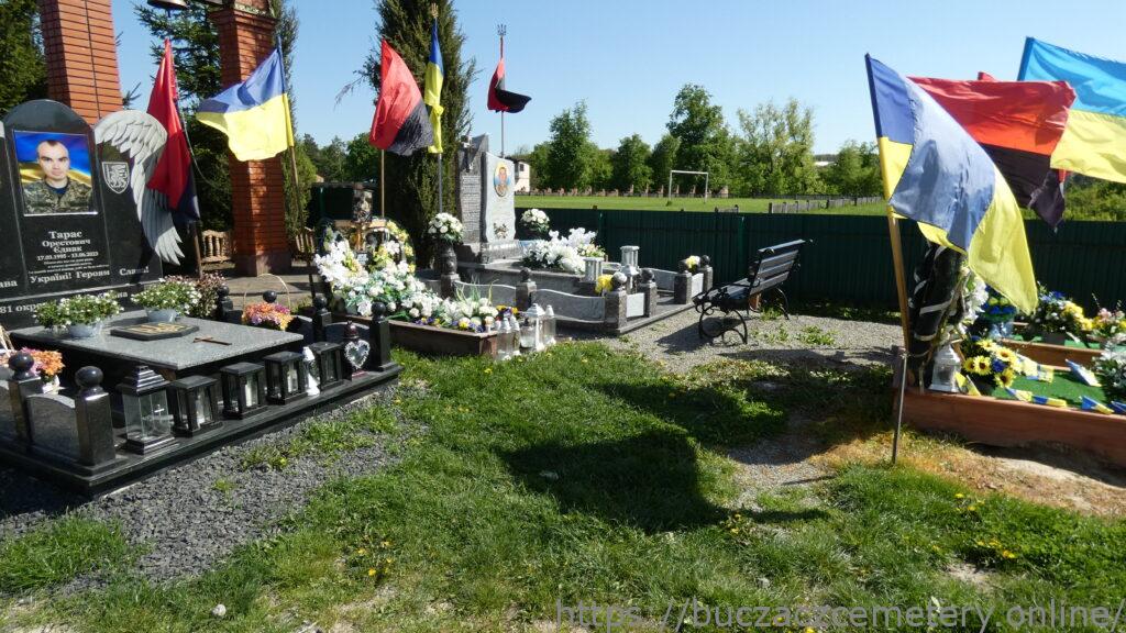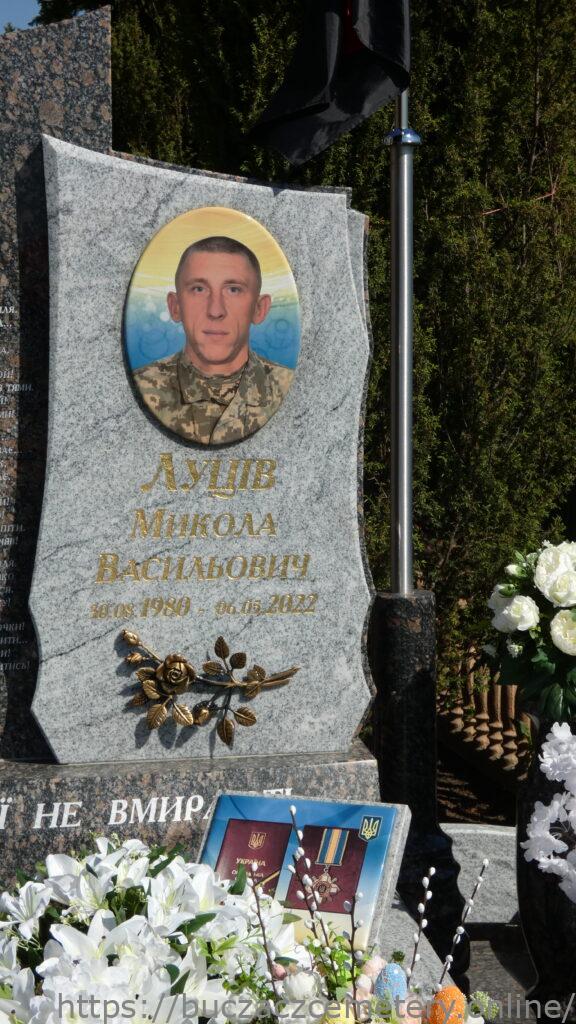 Напис: Луців Микола Васильович 10.08.1980-06.05.2022/ Здригнулась моя БУЧАЦЬКА земля. Привези батьківщині тіло СИНА… Убита горем вся Його рідня… Вже перед ним чорна домовина. / В ній спатиме роками наш Герой! Не йди синочку, я люблю тебе без тями. Ну як без тебе житиму? О-йой! Чекайте! Стійте! Не віддам до ями!/ А у Марійки – згарище думок… Всі плани на майбутнє з ним ховає… І згадує Миколи кожний крок, Й синочка за двох вже обіймає./ Давидку, синку, маму бережи! На тебе прокладаю всю надію! Пробач! Но на війну не міг я не піти. Я про дитинство твоє мирне мріяв! Відмивається від крові ще земля. І пташка в небі защебече дзвінко т Та лиш не стріну, доню тебе я. Ти розпізнай у небі мою зірку./ Простіть батьки, дружно, діточки! Ще так хотів би з вами тут пожити… Я ката убивав – щоб ВИ жили! Тепер на небі я за вас буду молитись!/