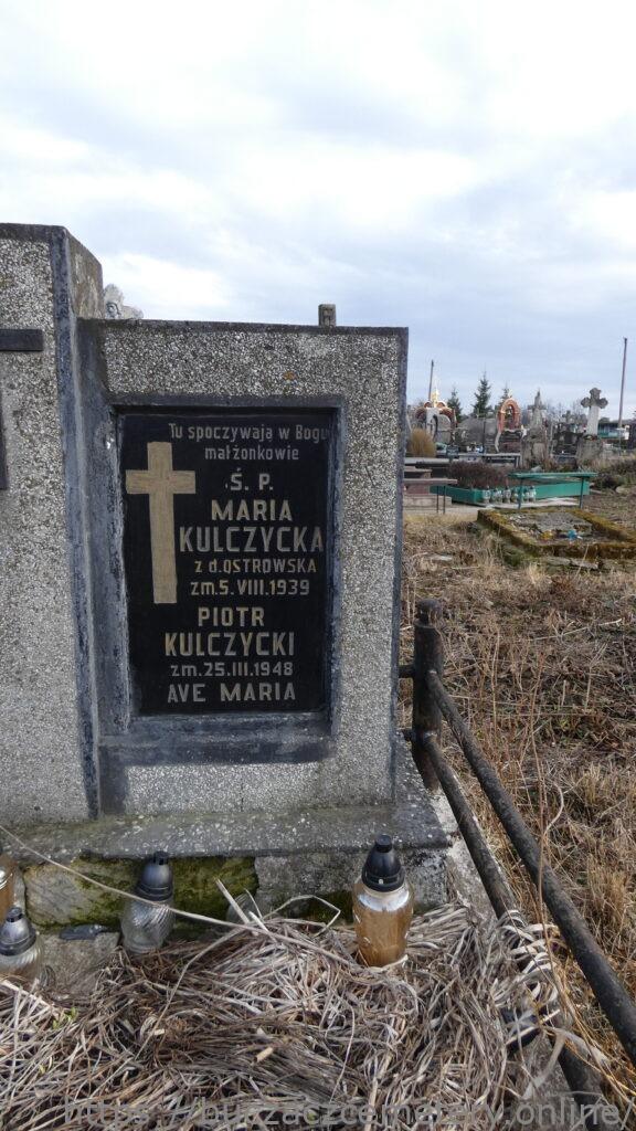 TU SPOCZYWAJĄ W BOGU / MAŁŻONKOWIE / Ś. P. / MARIA / KULCZYCKA / z d. OSTROWSKA / ZM. 5. VIII. 1939 / PIOTR / KULCZYCKI / ZM. 25. III. 1948 / AVE MARIA //.