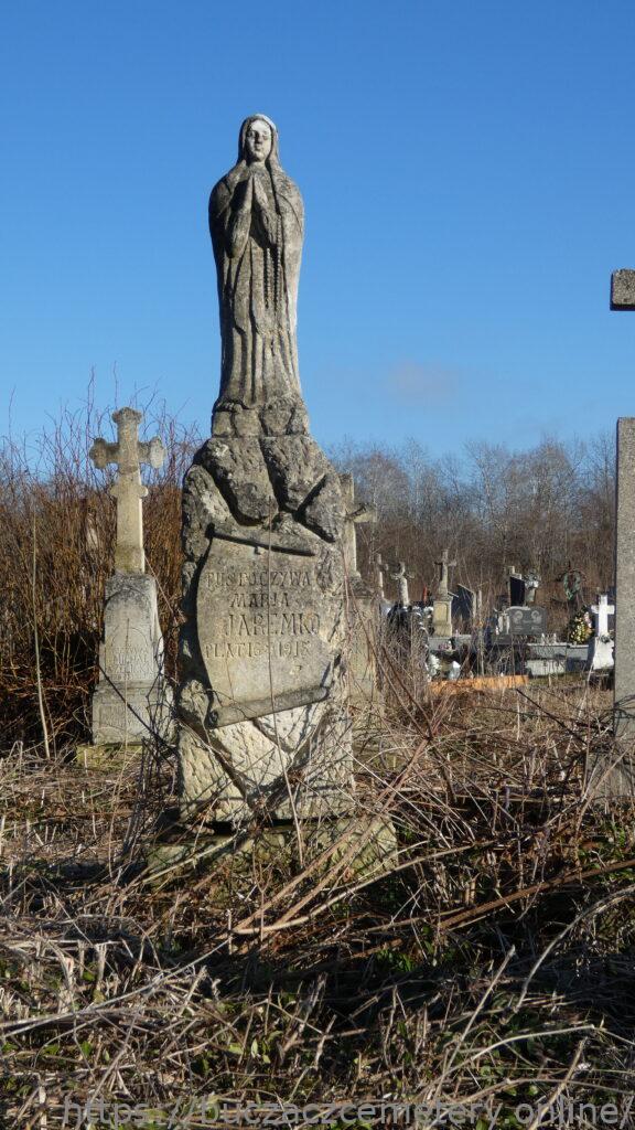 Місце поховання позначене статуєю Матері Божої Розарію на постаменті у вигляді скель і підстави. Фігура на постаменті, стилізована під хмари. Діва Марія зі складеними в молитві руками, над лівою рукою висить розарій. Одягнена в довгу сукню, підперезана поясом, плащем і вуаллю, боса. На постаменті спереду розміщено табличку у вигляді розгорнутого сувою з вигравіюваним написом.