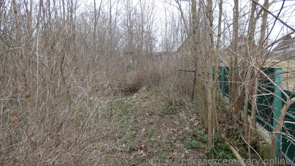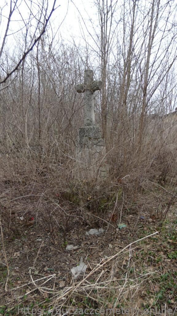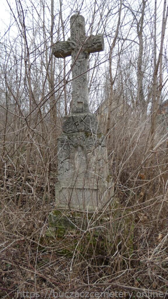 Місце поховання позначено хрестом, стилізованим під стовбур дерева, на двоступеневому постаменті у вигляді скель і двоступеневої основи. Хрест на постаменті, що імітує кам’яні тесані. Через перехрестя гербів, прикрашених барельєфними гілками винограду та дубовим листям, звисає терновий вінок, внизу — порожнє прямокутне місце для фотографії. Перша і друга сходинки основи зернені. На лицьовій стороні першої сходинки цоколя вміщено панель із гравійованого рамкою з чверть кругло зрізаними верхніми кутами, всередині якої є гравійований напис. На другій сходинці цоколя спереду розташована ніша, закрита суцільною аркою, обрамлена барельєфною виноградною лозою. На ній рельєфна фігура Матері Божої Розарію зображена фронтально, з вервицею, що висить над її правою рукою, і її руки складені в молитовному жесті. У фаті, плащі та довгій сукні.