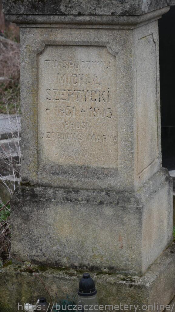 Напис: TU SPOCZYWA / MICHAŁ / SZEPTYCKI / * 1851. + 1905. / PROSI O ZDROWAŚ MARYA //.
