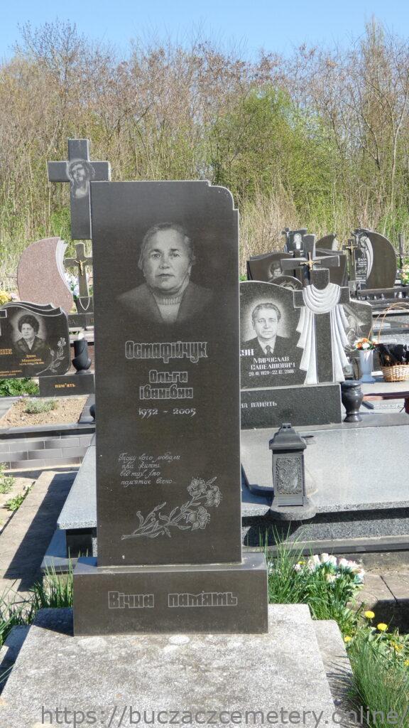 Напис: Остафійчук Ольга Іванівна 1932-2005/ Тому кого любили при житті, від тих хто пам’ятає вічно…/