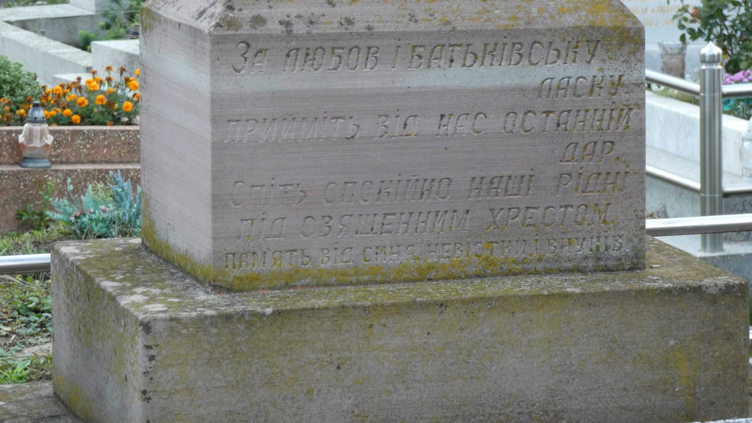 За любов і батьківську ласку/ Прийміть від нас останній дар/ Спіть спокійно наші рідні/ Під священним хрестом/ пам’ять від сина, невістки і внуків