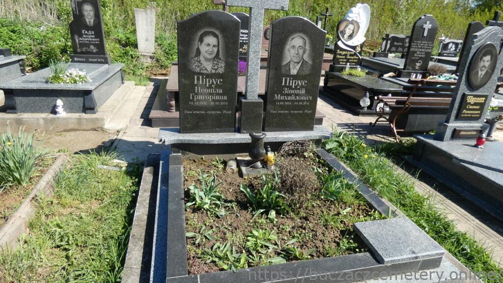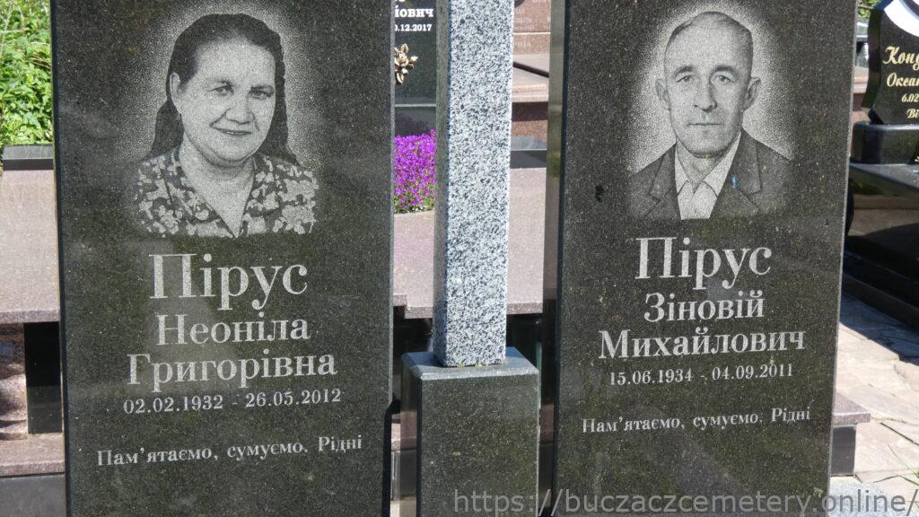 Напис: Пірус Неоліна Григорівна 02.02.1932-26.05.2012/ Пірус Зіновій Михайлович 15.06.1934-04.09.2011/ Пам’ятаємо, сумуємо. Рідні.