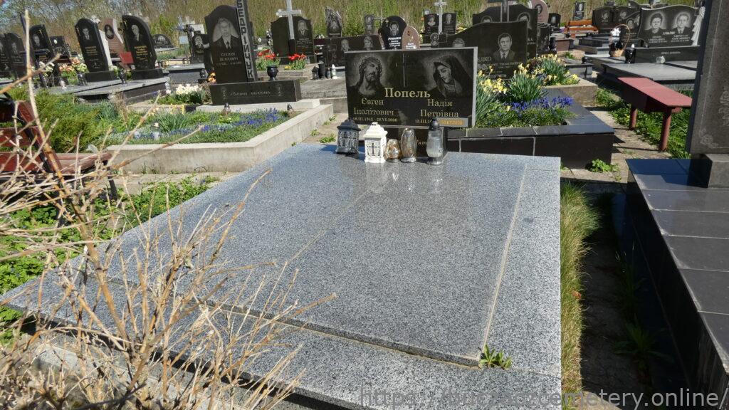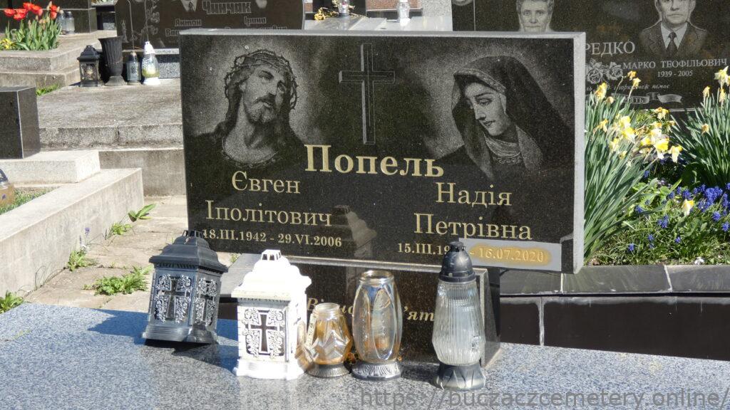 Напис: Попель Євген Іполітович 17.ІІІ.1942-29.VI.2006/ Надія Перівна 15.ІІІ.1947-16.07.2020/ Вічна пам’ять/