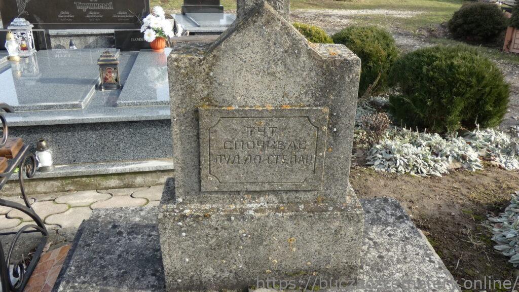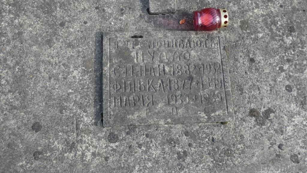 Напис: ТУ СПОЧИВАЄ/ ПУДЛО / СТЕПАН 1882-1932/ФІЛЬКА 1877+1919/ МАРІЯ 1930-1939/ВП/