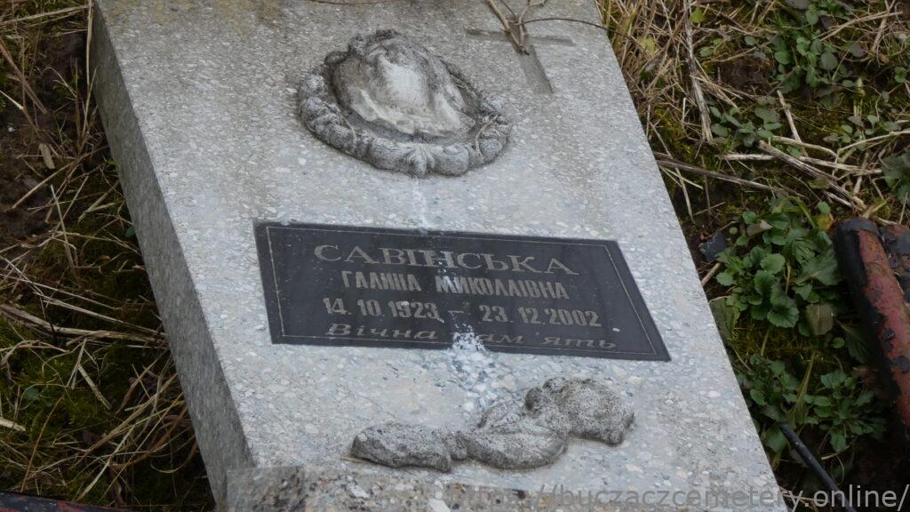Напис: САВІНСЬКА ГАЛИНА МИКОЛАЇВНА 14.10.1923-23.12.2002/Вічна пам’ять/