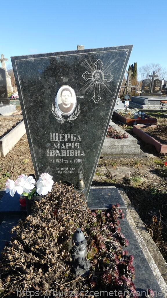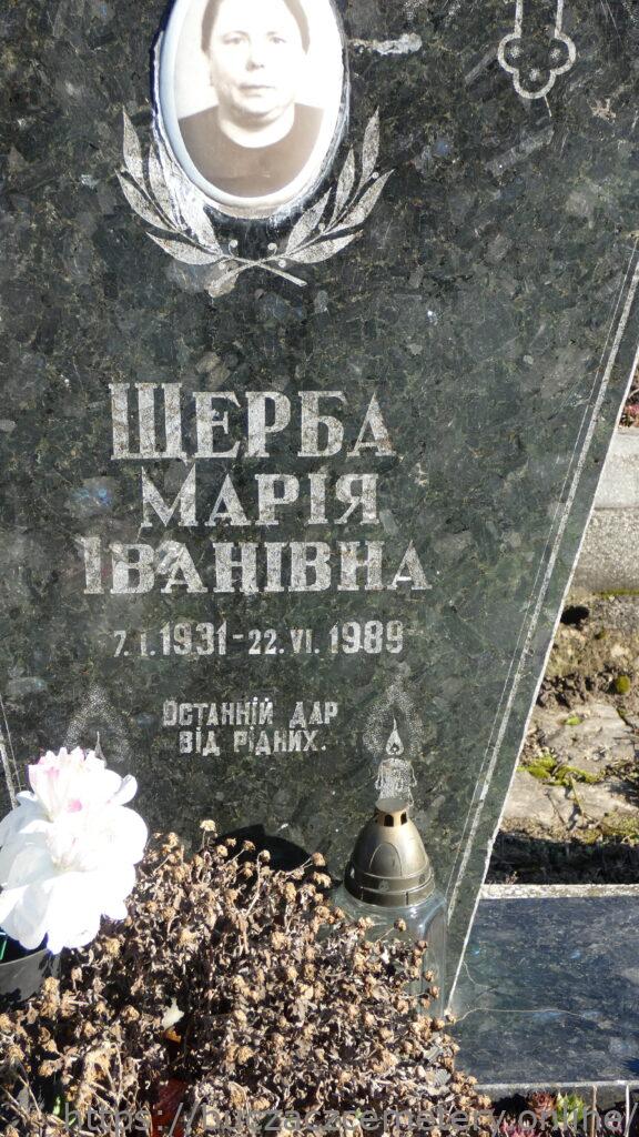Напис: Щерба Марія Іванівна 7.І.1931-22.VI.1989/ Останній дар від рідних//