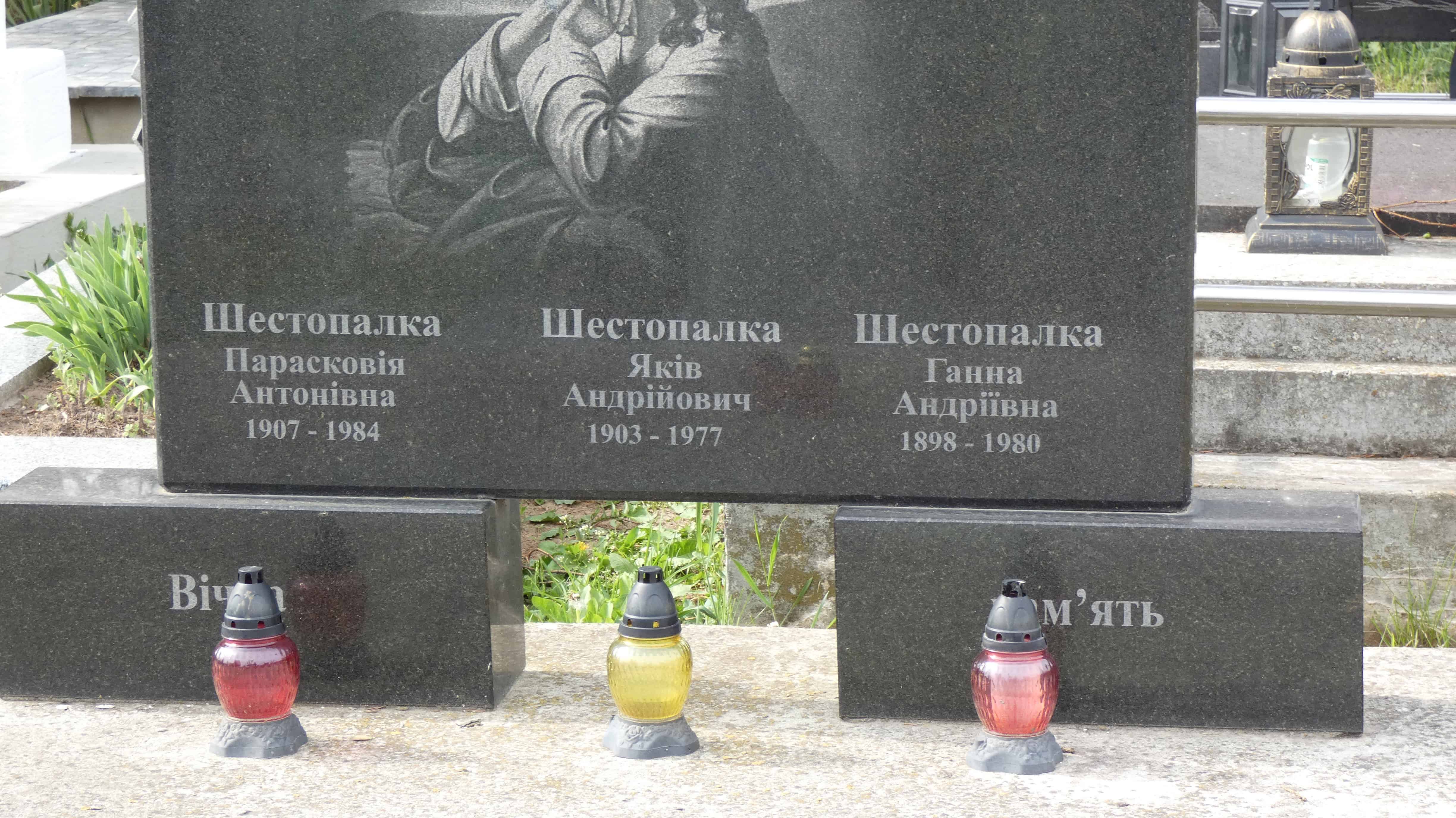Похований (на): Шестопалка Парасковія Антонівна 1907-1984 Шестопалка Яків Андрійович 1903-1977 Шестопалка Ганна Андріївна 1898-1980